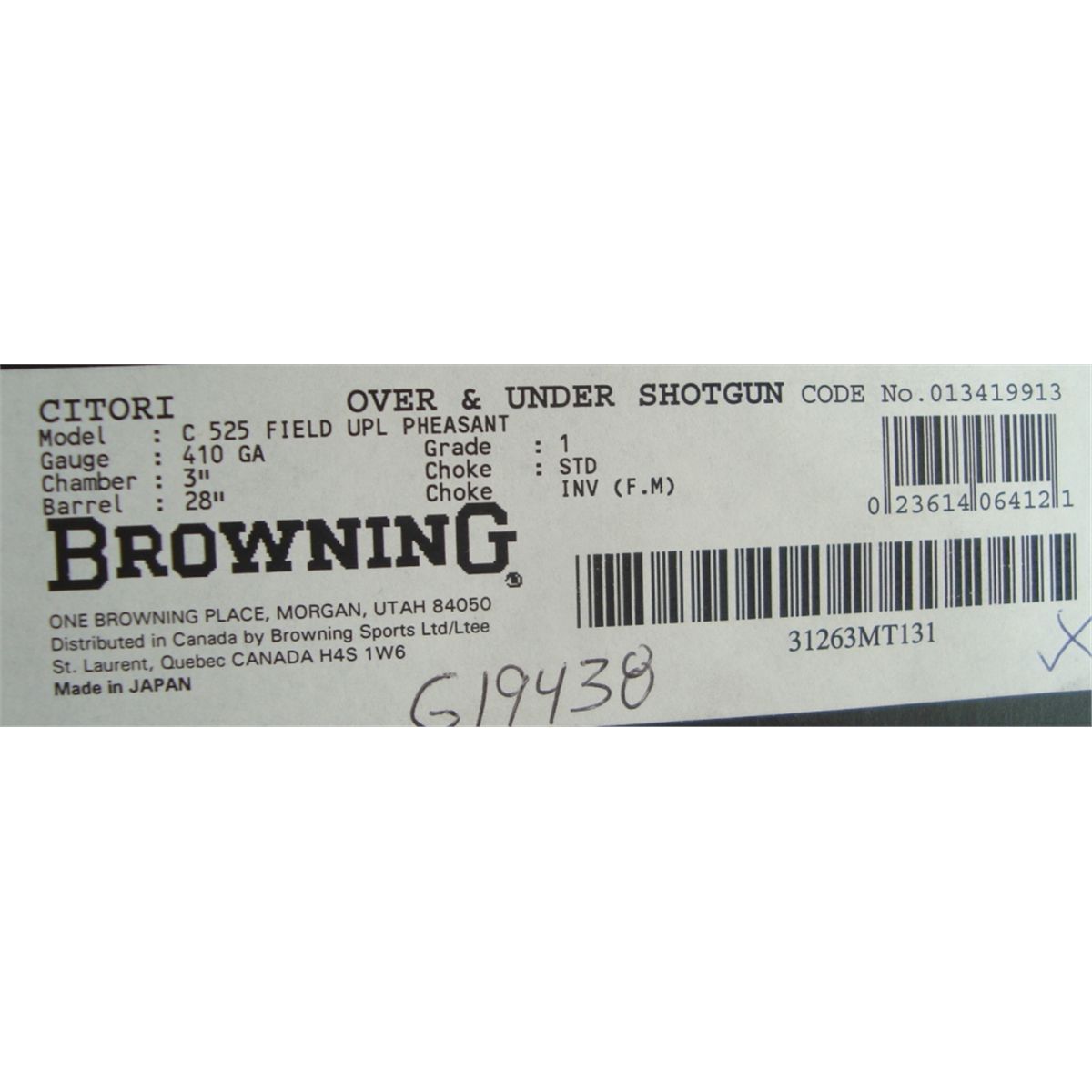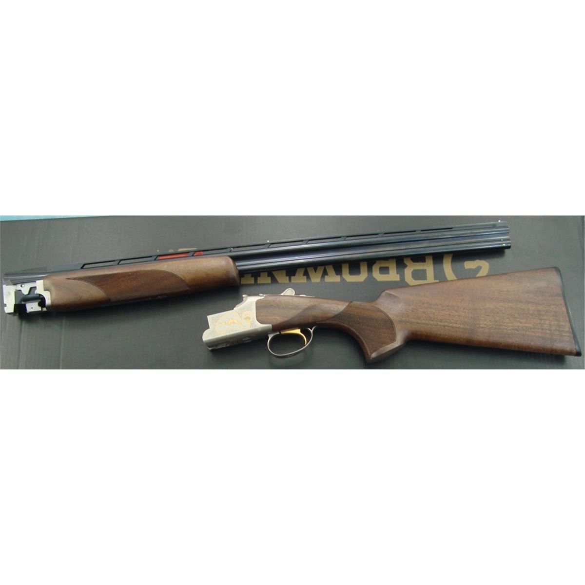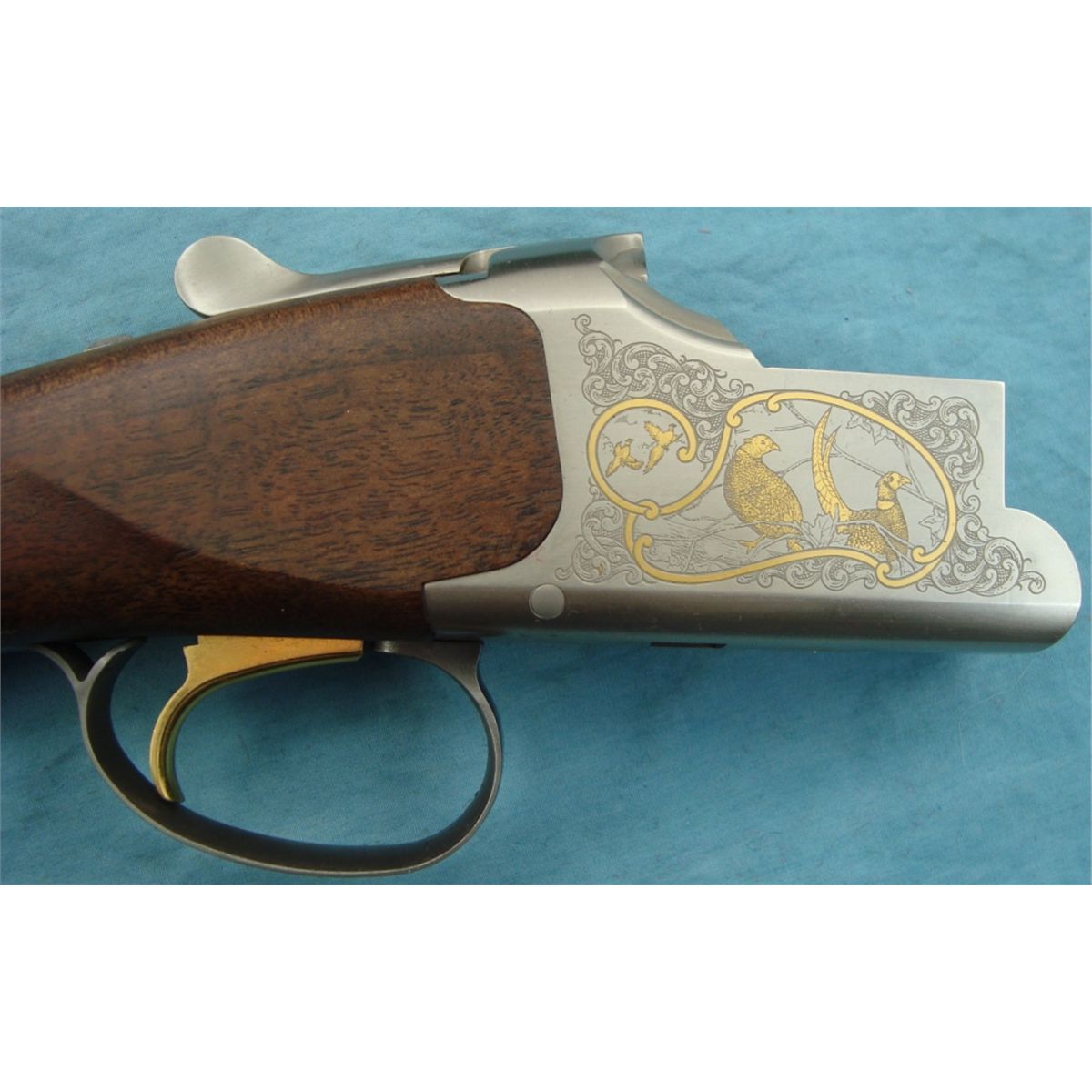#31263MT131; 410 ga. Upland Game Series 63 of 100. Features a silver coin receiver w/golden laid pheasant scenes. Single trigger & automatic ejectors. Walnut stock w/Browning invector chokes. Condition is NIB.