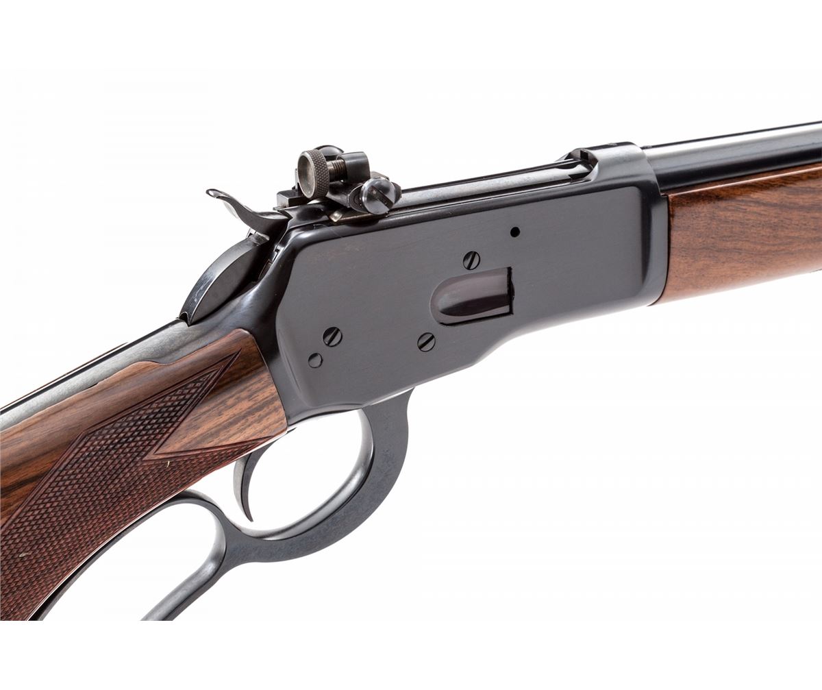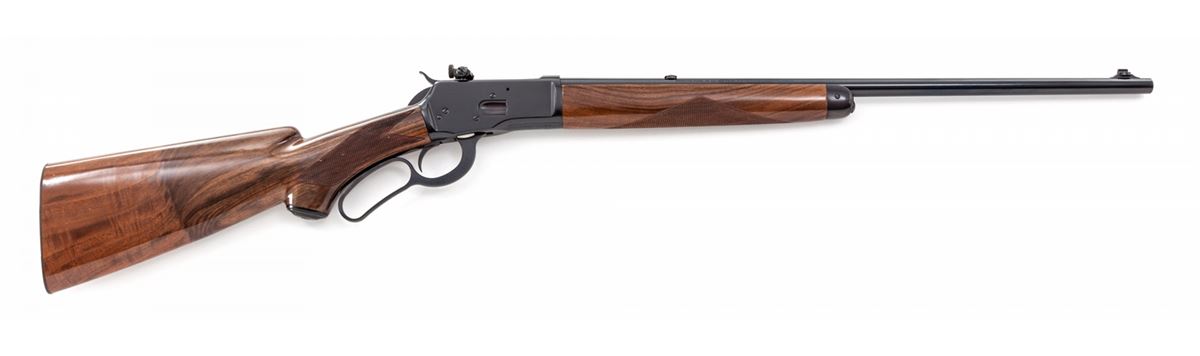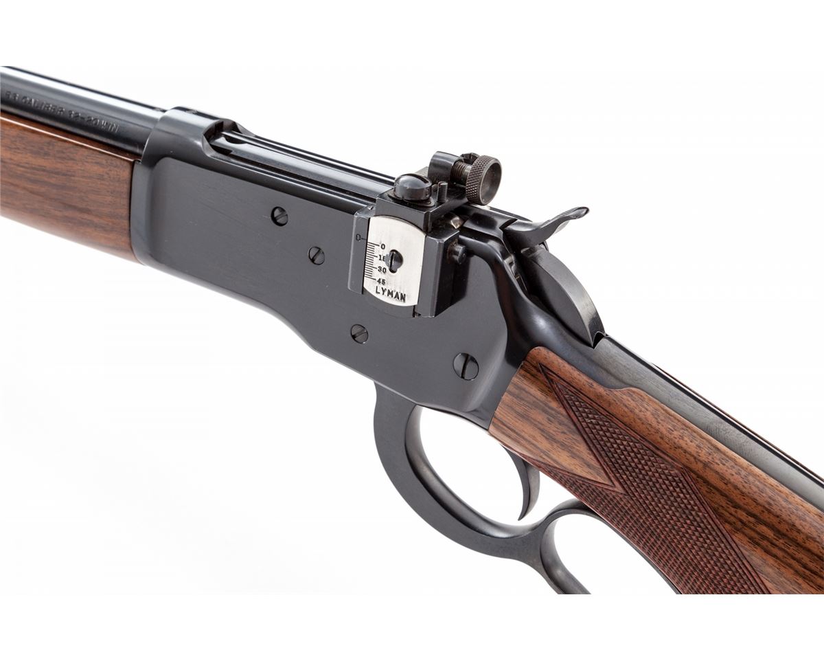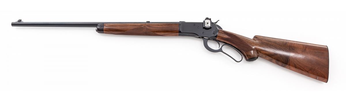 Browning Model 53 Lever Action Rifle, #01128NM3F7, .32-20 cal., 22'' barrel, blue finish, factory checkered walnut stock and forend, with Lyman peep sight. Condition is excellent showing one small scratch near toe of buttplate on right side and very light marks from handling. Action is crisp, bore is bright. Est.: $600-$800. (Modern) (Ian Shein estate)