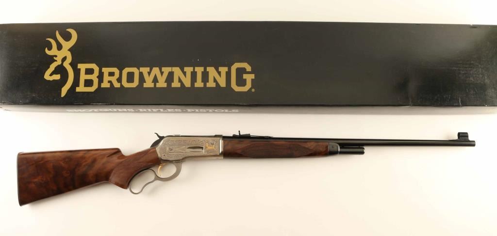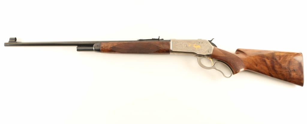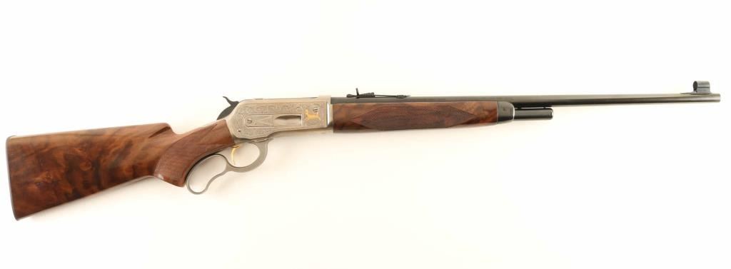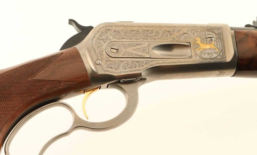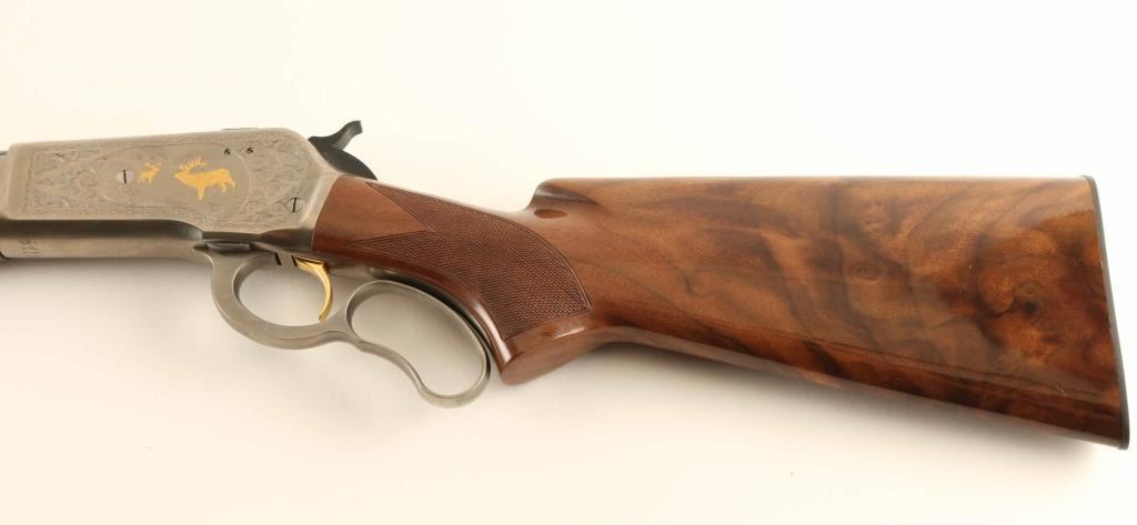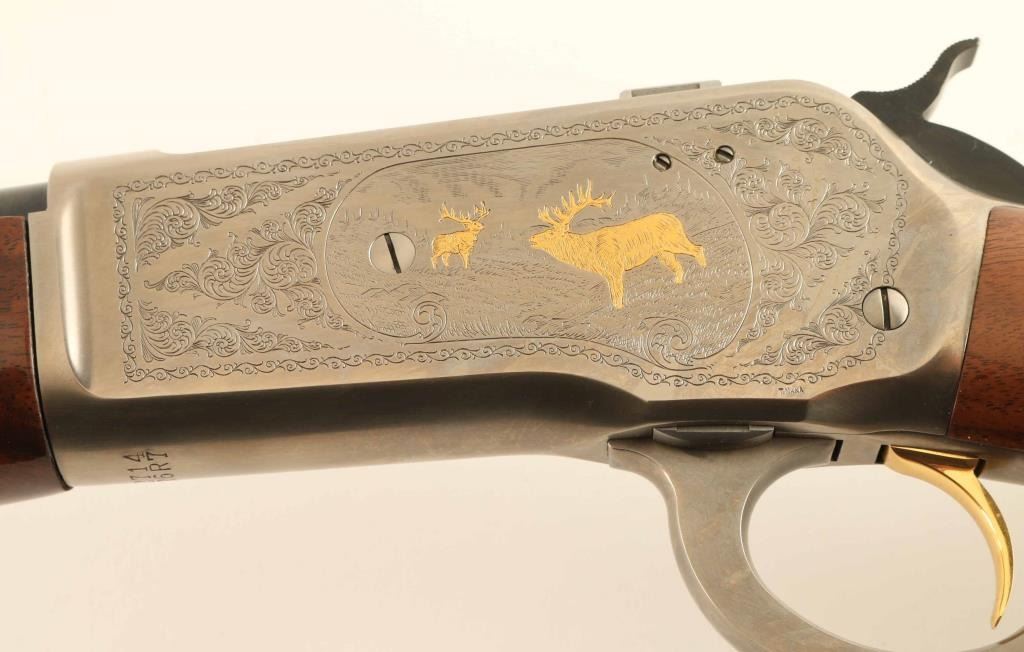 Embellished high quality reproduction of the Winchester Model 71 rifle chambered in .348 Winchester. Manufactured in Japan by Miroku circa 1987 with only 3,000 rifles produced. Features a blued 24" tapered barrel, ramped & hooded blade front sight with brass bead, elevation adjustable semi-buckhorn rear sporting sight, greyed receiver singed T. Naka embellished with floral scroll & gold accented elk & deer game scenes, 4-round tubular magazine, smooth gold trigger, serrated hammer spur, curved finger lever, checkered semi-beavertail select walnut forend with metal cap & high gloss finish and pistol grip shoulder stock with knurled metal buttplate. Includes the original factory box with manual. Rifle exhibits approximately 99%+ of it's original finish showing little to no visible wear. Action is smooth, the bore is pristine and the wood stocks are fine. Condition is like NRA Perfect in box. ***Modern Firearm***