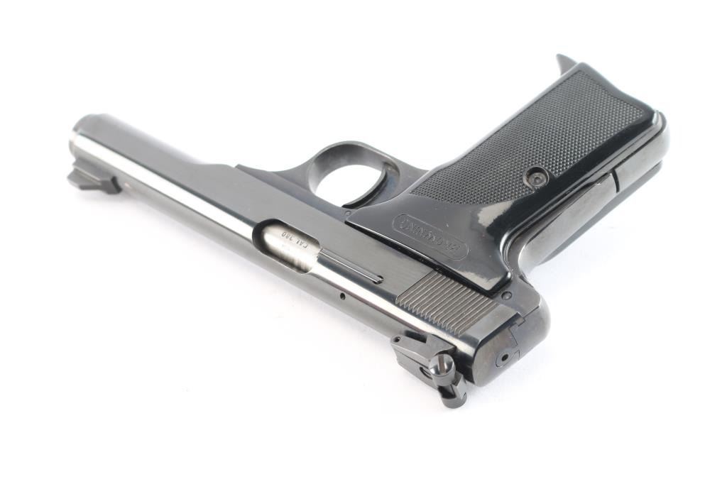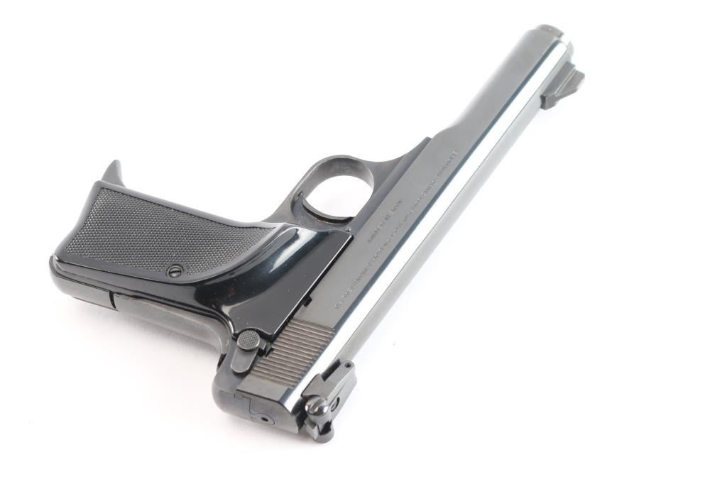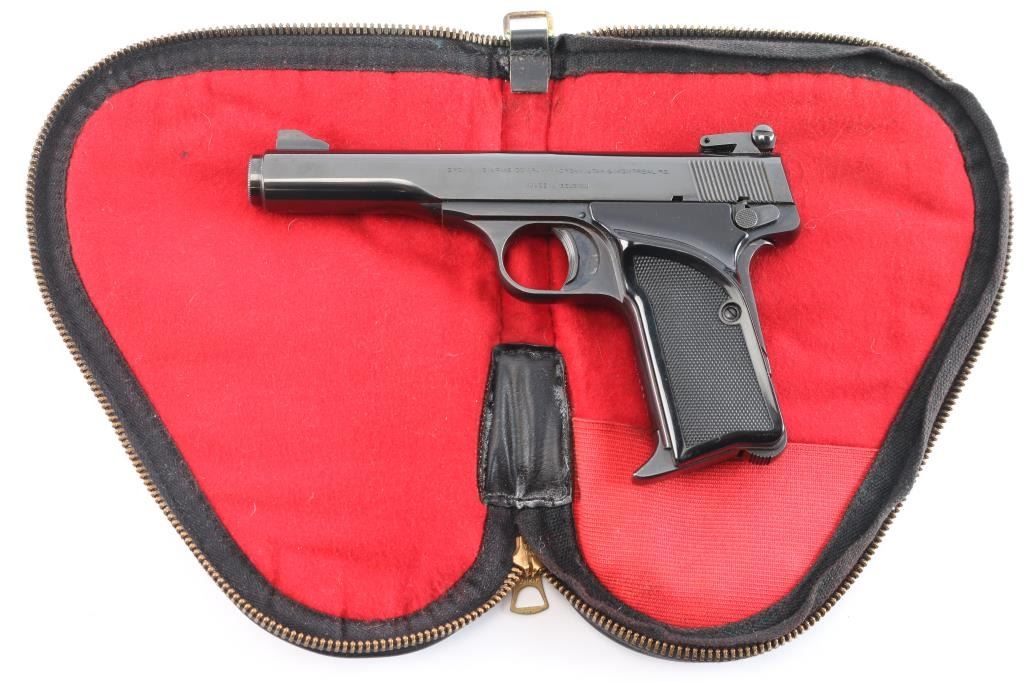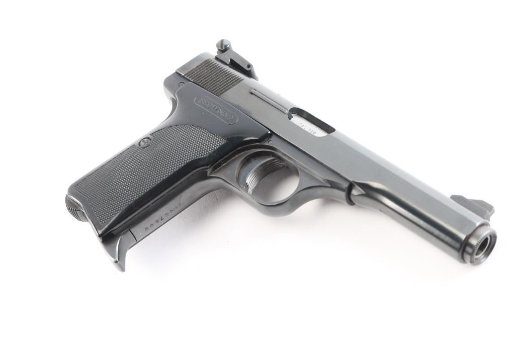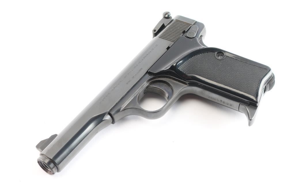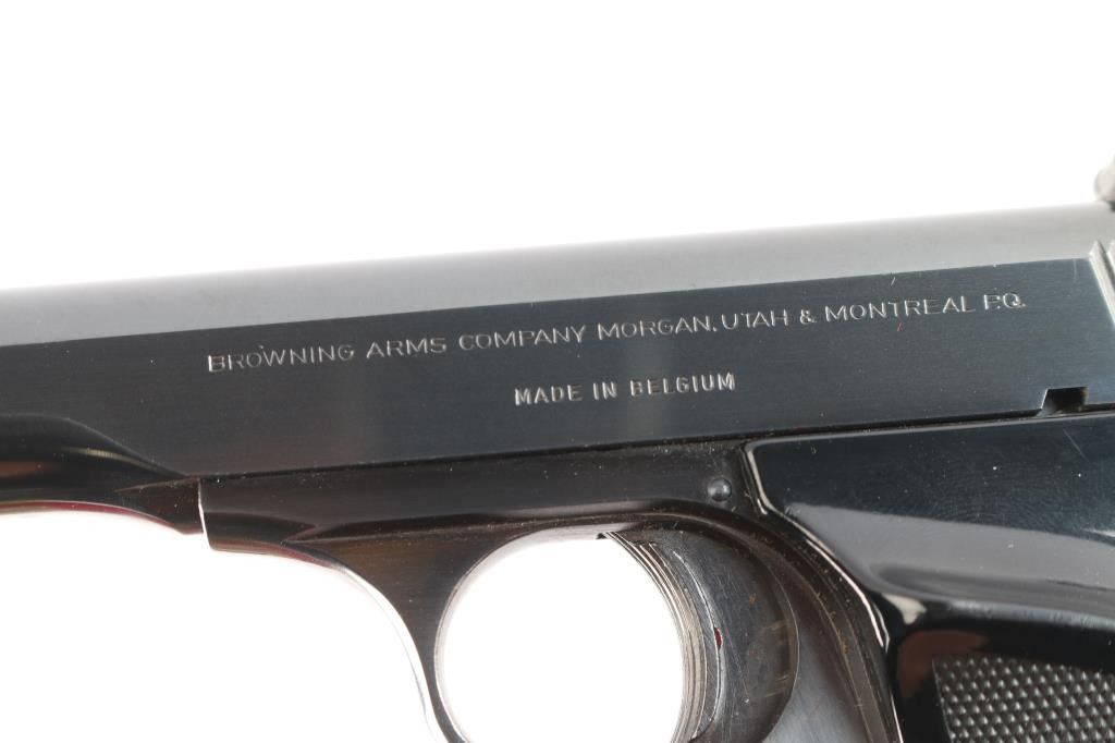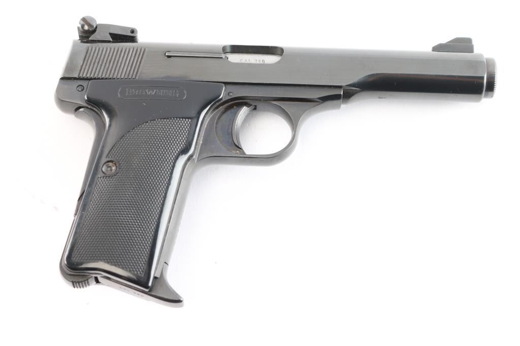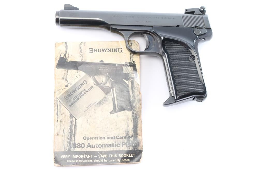Scarce striker fired semi-automatic pistol chambered in .380 Auto, manufactured in Belgium by Fabrique Nationale circa 1971. First year of production, produced 1971-74. A striker-fired, blowback action, single-stack with 6+1 capacity. The model 71 came about with the introduction of the 1968 GCA, which stopped the importation of the Model 1910. Features a blued finish, 4.4" barrel, serrated ramp front sight, fully-adjustable ‘beer can’ rear sight, serrated wide trigger, cocked indicator, manual safety/slide catch on the left side of the frame, grip safety, magazine disconnect safety, heel magazine release, factory 6 round magazine with integral finger rest grip extension, steel frame and checkered factory grips with left thumb rest. Pistol retains approximately 95% of its original finish showing minor edge wear/minor rub on the slide. Action is smooth, the bore is pristine and the grips are fine. Come in Browning soft case, red felt lining and owners manual.
