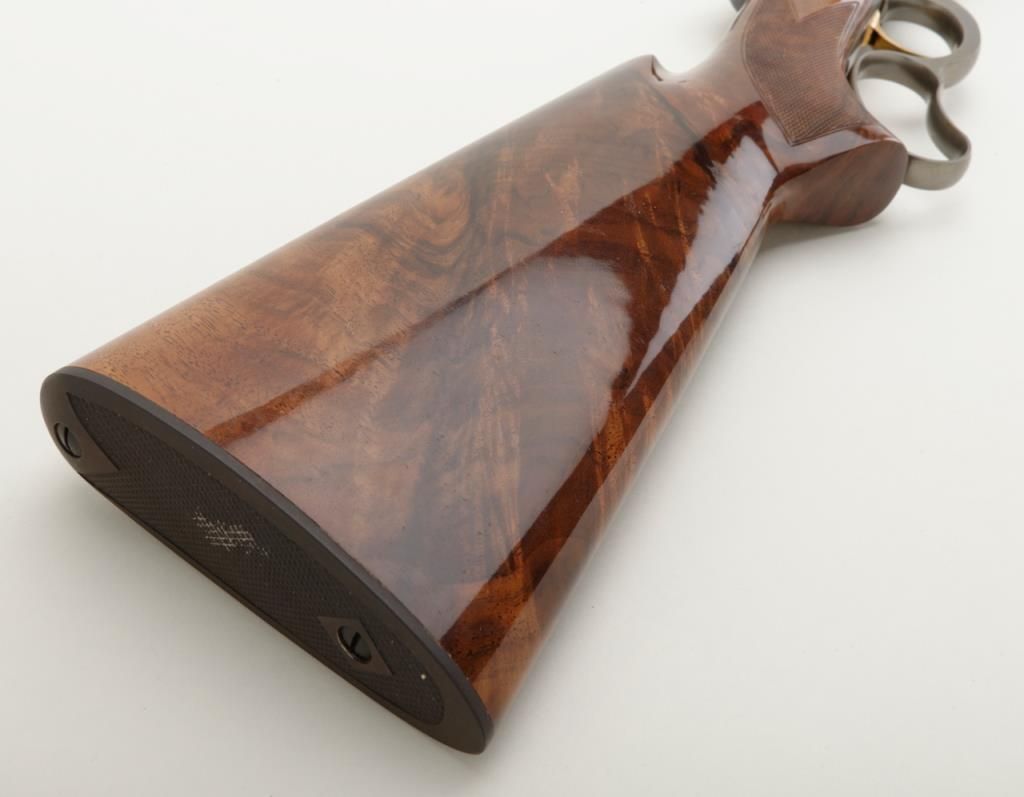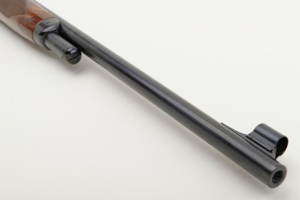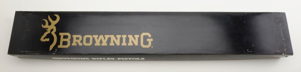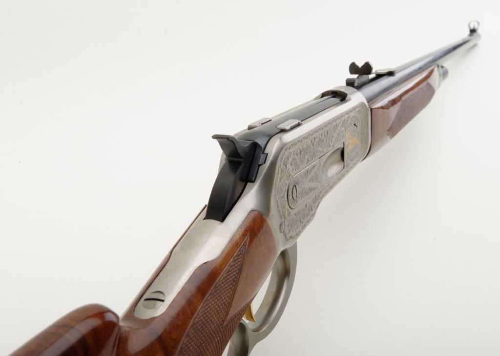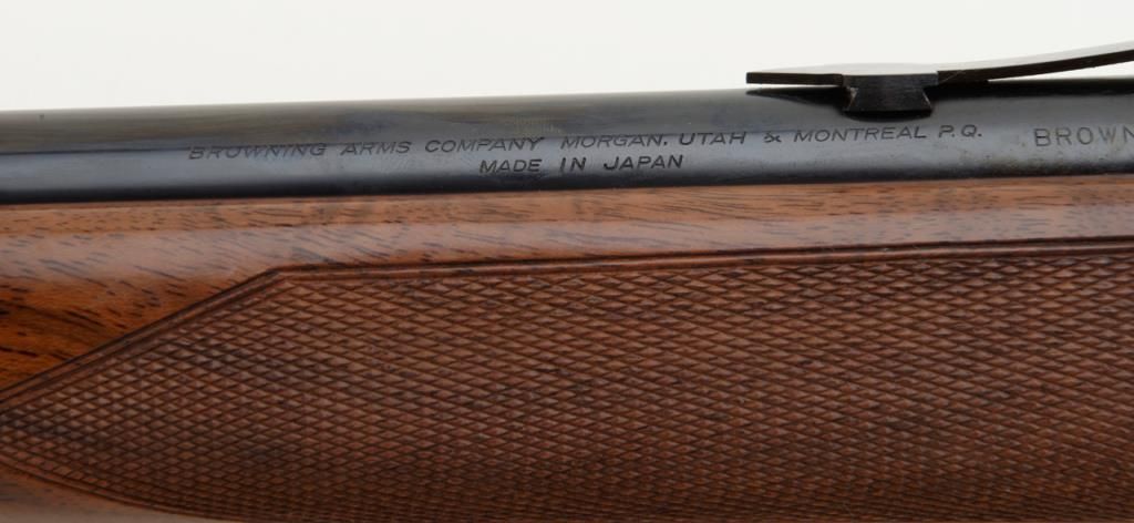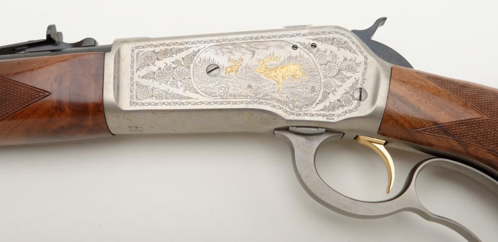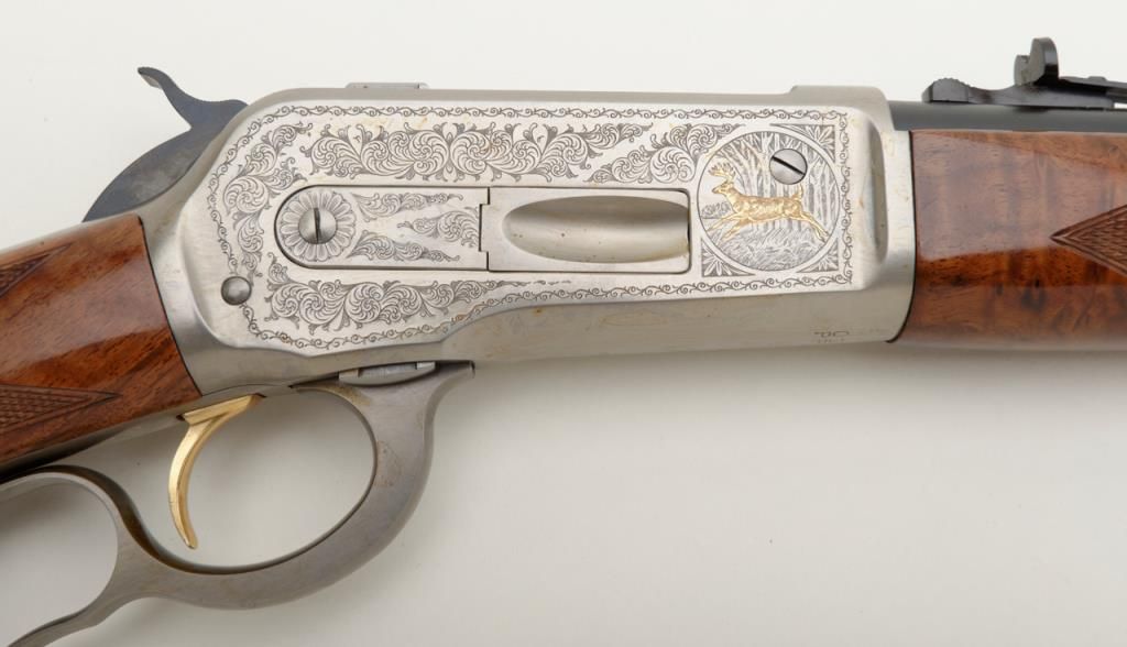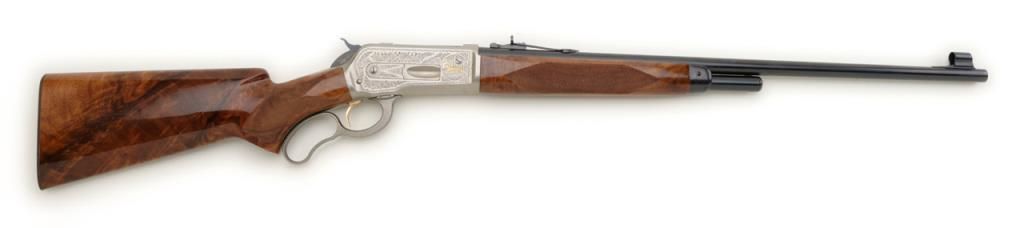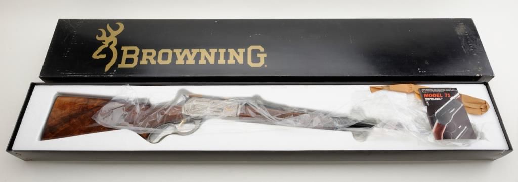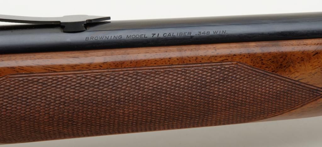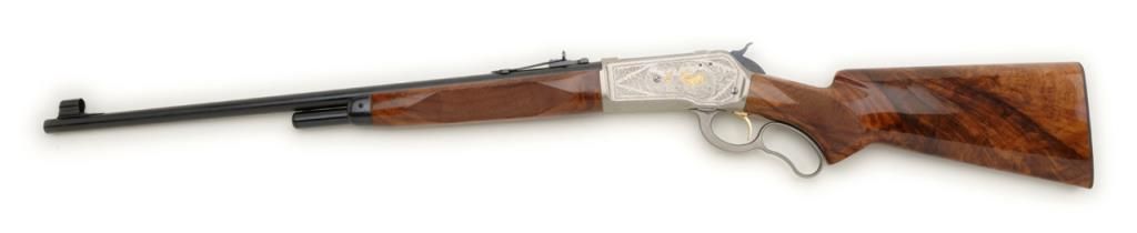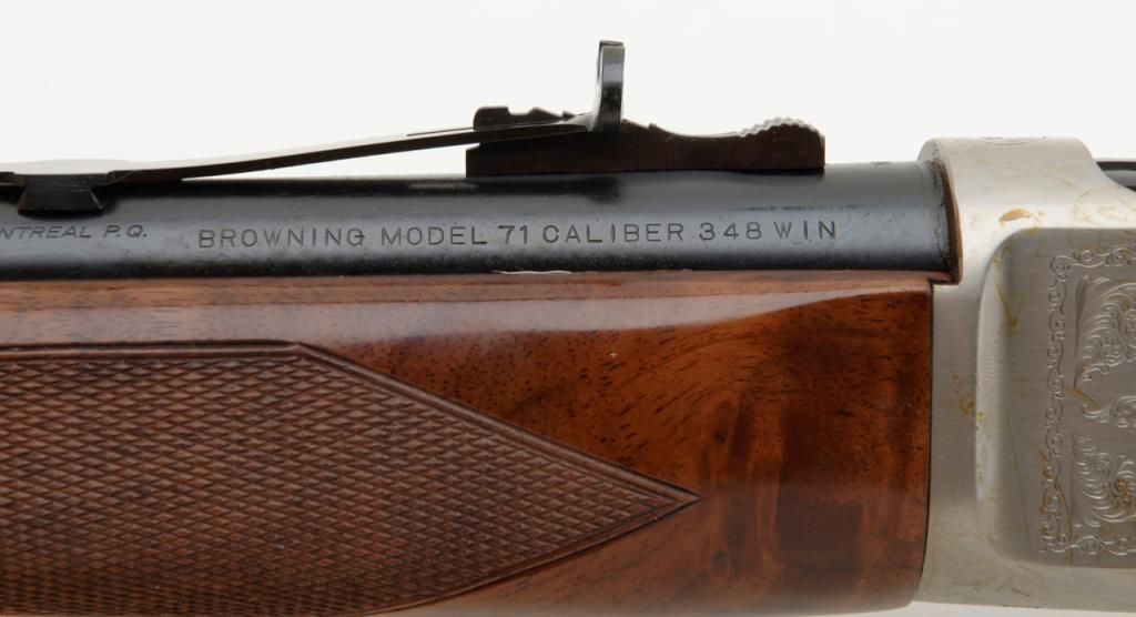 Browning Model 71 Deluxe lever action engraved rifle, .348 cal., 24” round barrel, black finish to barrel and half magazine, bright receiver showing extensive scroll engraving and two panel scenes; gold colored buck on right side of receiver with two gold colored elks on left side of receiver; checkered deluxe semi-pistol grip stocks with checkered steel shotgun butt plate, #01435PR6R7 in like new condition showing little handling, in original factory cardboard box with instructions and end label numbered to this gun. Est.: $1,000-$2,000.