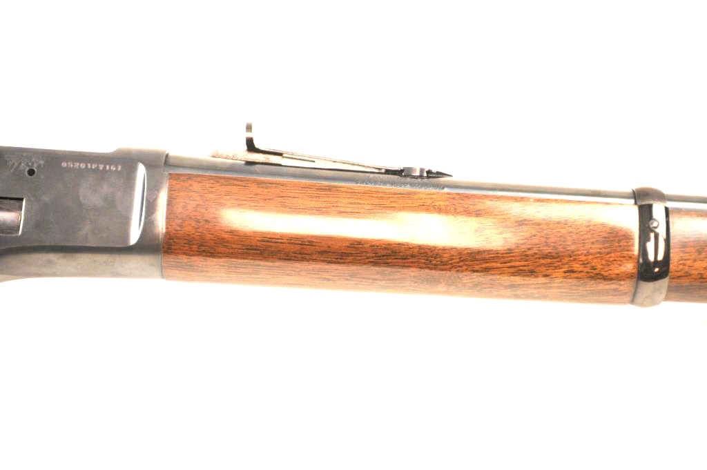 Browning Model 92 lever action rifle, .357 Magnum caliber, Serial #059201TY167. The rifle is as new in the factory box with a 20” round barrel and full-length magazine. The rifle retains approximately 98-99% of theoriginal blue finish with light handling marks. The smooth wood stocks are in excellent condition with a smooth steel crescent butt plate. Est.: $600-$1,200. (Modern).