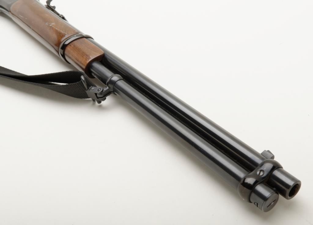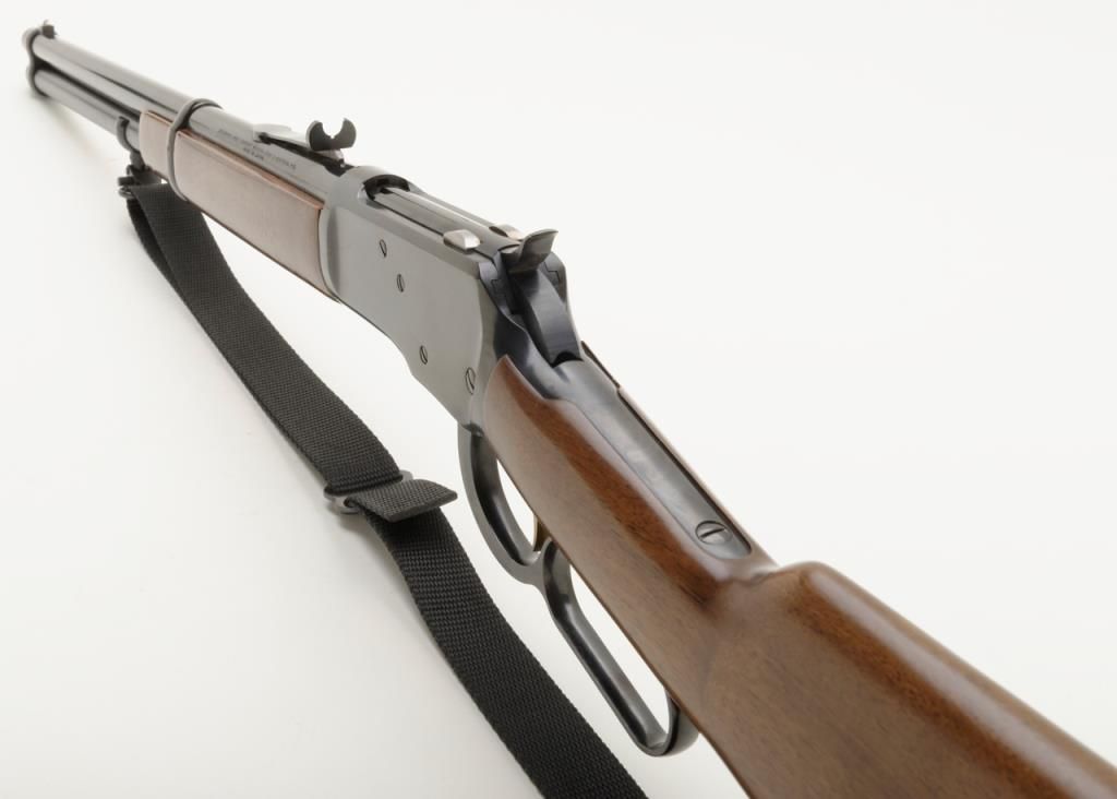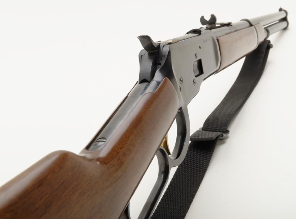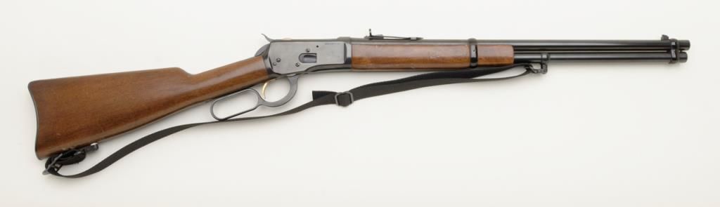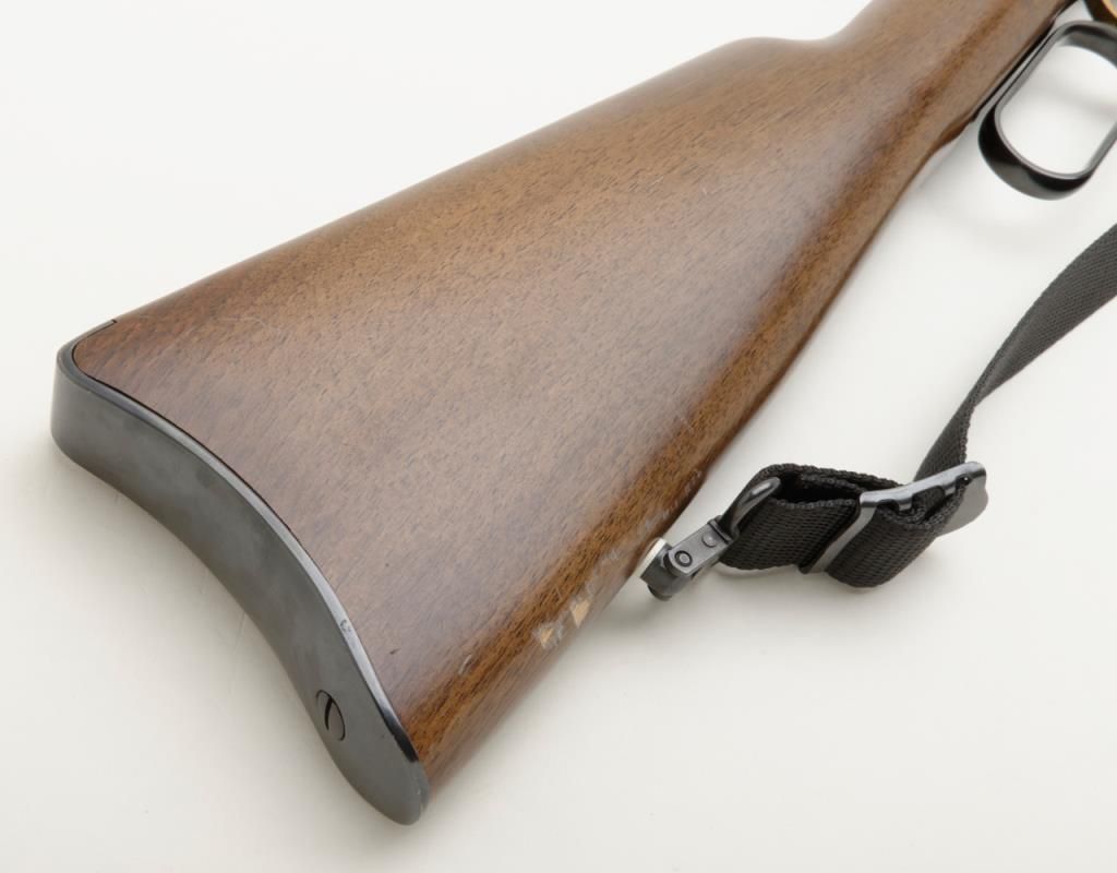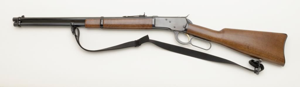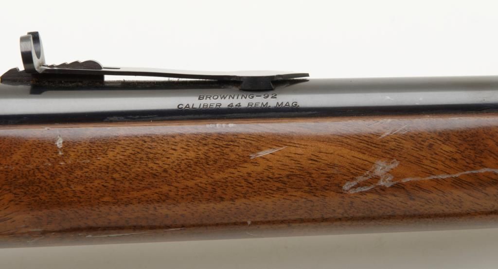 Browning Model 92 lever action rifle in .44 Magnum caliber, serial number 06023PM167. The carbine has had detachable sling swivels added and a fabric sling is also included. Condition is fine to near excellent used condition with some minor scratches in the varnish of the stock and about 98% to 99% blue. Some evidence of firing and minor use. Est.: $300-$600