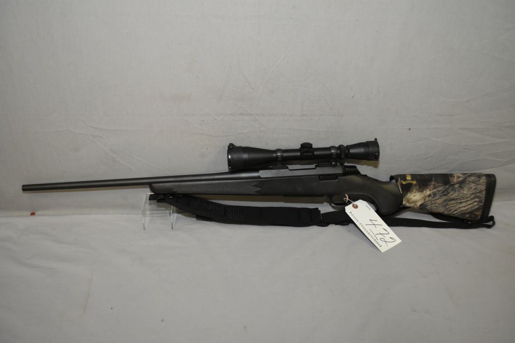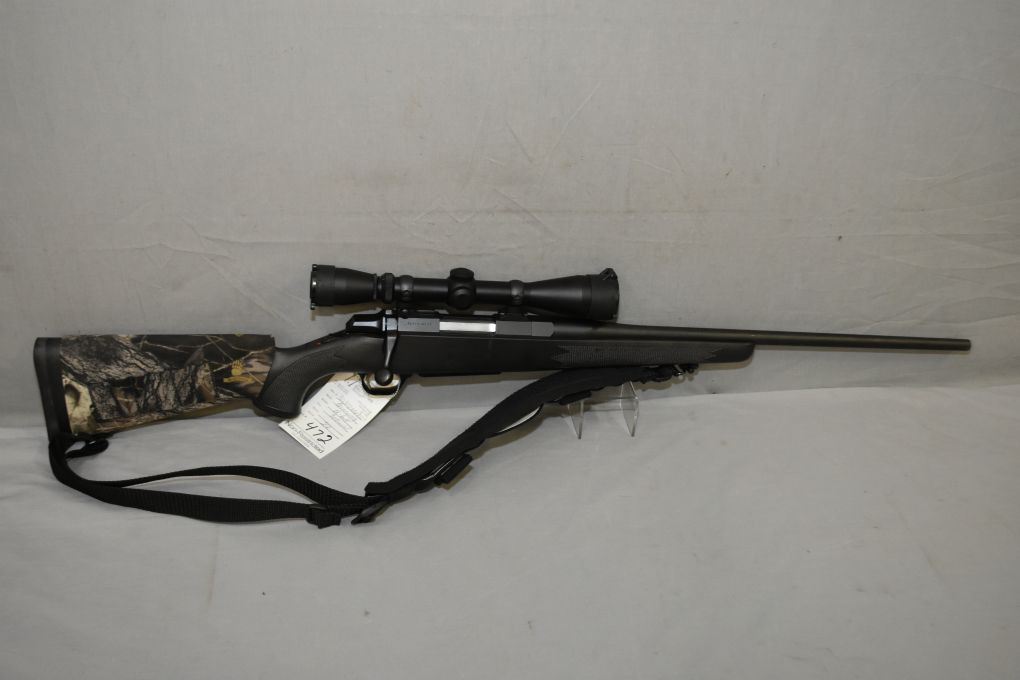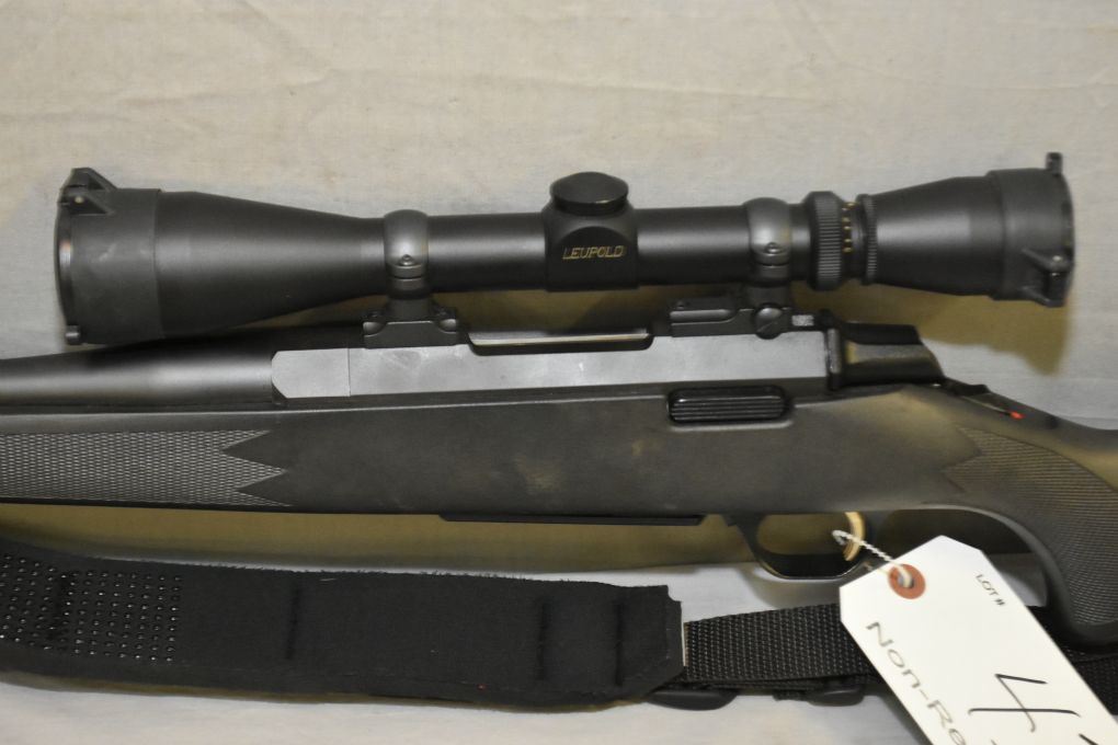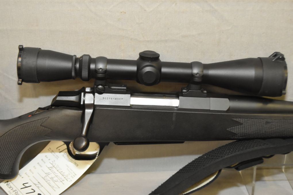 Browning Model A Bolt .308 Win Cal Interior Mag Fed Bolt Action Rifle w/ 22" bbl [ appears excellent, blued finish, no sights, but fitted w/ Leupold Vari X II 3 x 9 Variable Scope, w/ scope covers, Bear Teeth camo cartridge holder, black composite checkered pistol grip stock, black padded nylon sling w/quick off swivels, Browning recoil pad ] Ser # 30318NW8C7