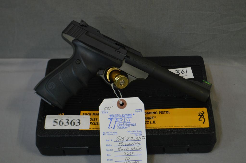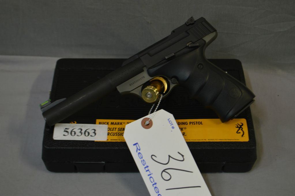 Browning Model Buck Mark .22 LR Cal 10 Shot Semi Auto Pistol w/ 140 mm bull bbl [ appears excellent in original box marked Ultragrip RX PRO TGT 5 1/2" Camper , two tone finished flat black and grey, adjustable rear sight, glo thru front sight, Browning rubber grips, gold plated trigger, c/w test fired rounds, and Browning card ] Ser # 515ZZ01172 Restricted Handgun Cert # tci