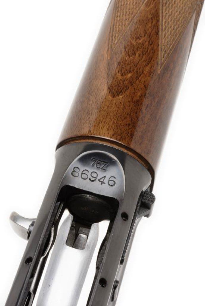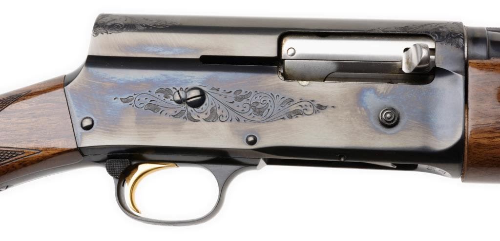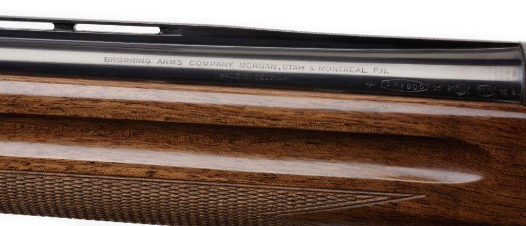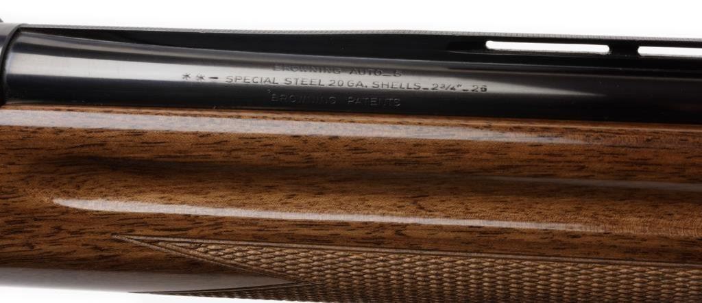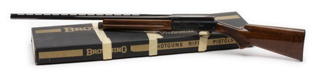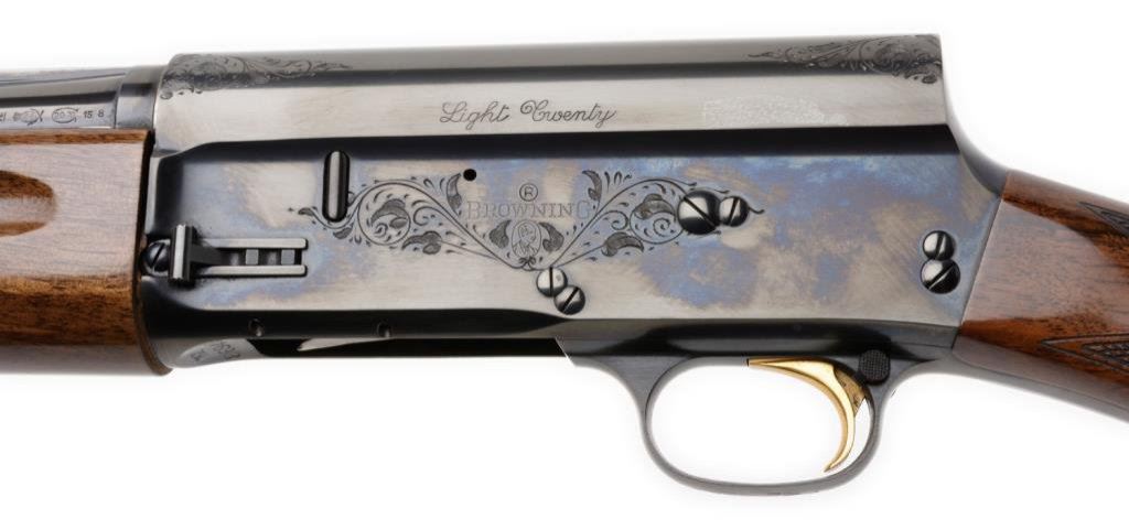 **Browning Model Light 20 semi-automatic shotgun, 20 gauge with a 26” blued barrel, S/N 76Z86946. The shotgun is in overall very good to nearly excellent condition with a 26” blued barrel with full length ventilated rib and improved cylinder choke. The barrel and receiver retain nearly all of their blued finish with light scroll engraving on the action. The high gloss checkered wood stocks are in overall very good condition showing nice figure and grain with only slight handling marks visible. The stock ends in a hard rubber Browning marked butt plate with a 14 ¼” LOP. The shotgun comes in the original Browning box with paperwork and packaging material. The action is crisp, markings sharp and bore excellent on this shotgun. Est.: $400-$800.