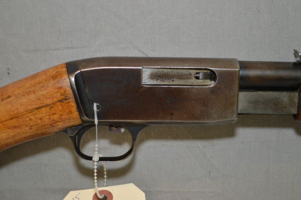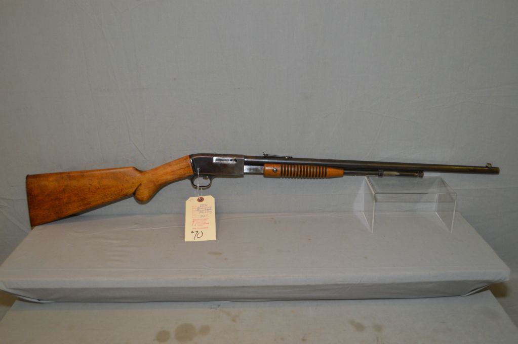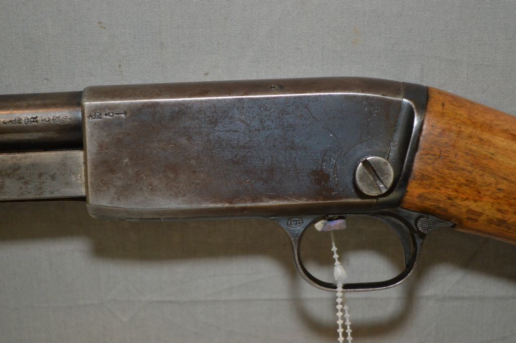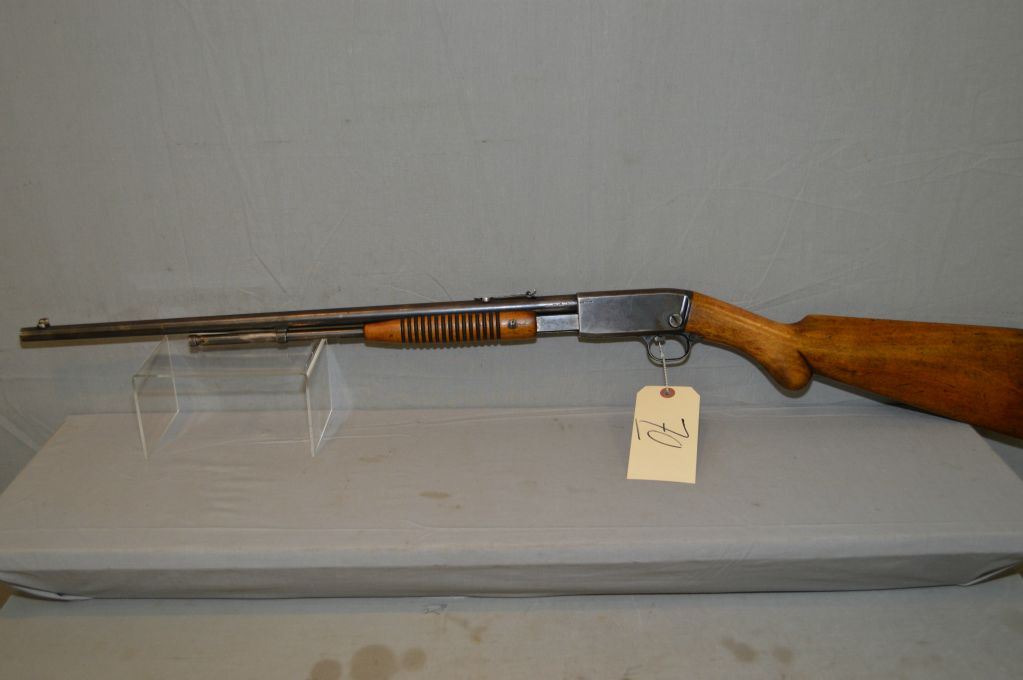 Browning Model Trombone .22 Long Only cal Tube Fed Pump Action Rifle w/ 22" bbl [ fading blue finish w/barrel slghts, rounded pistol grip stock with multiple cracks behind receiver at wrist , good grooved forend w/metal butt plate ( 81) ] Ser # 8810