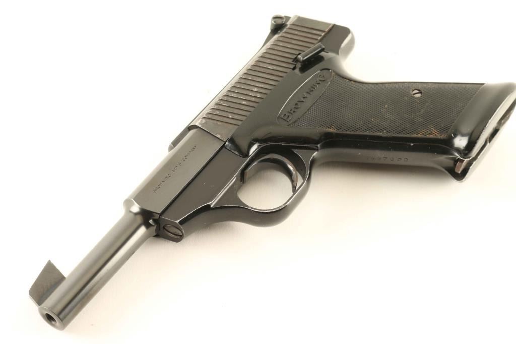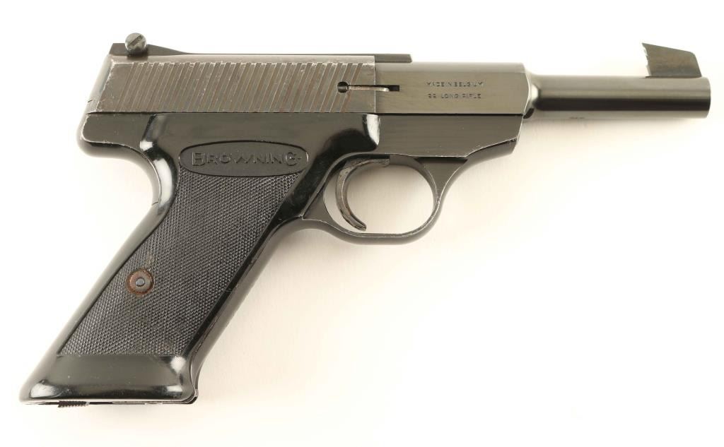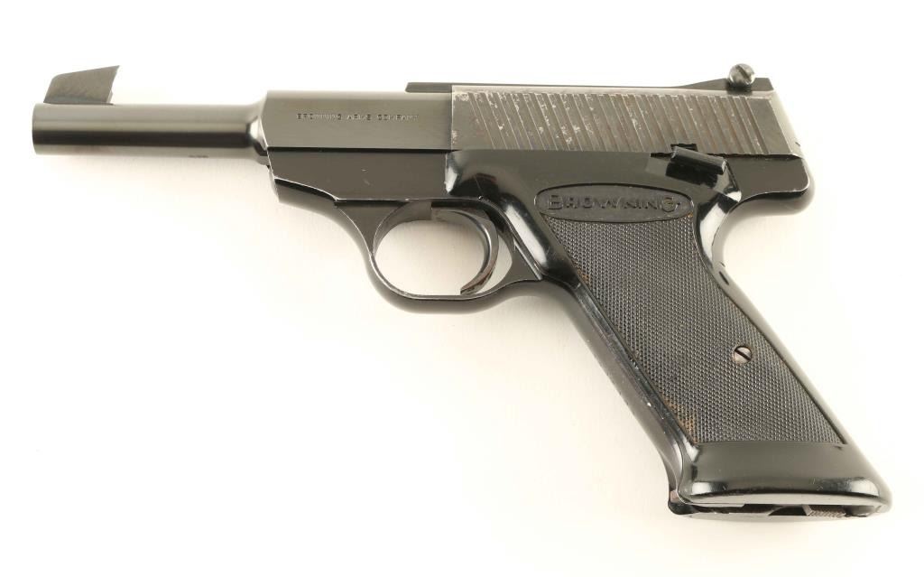 Belgian made single action semi automatic target pistol chambered in 22 long rifle, manufactured circa 1962. Features a blued/black finish, 4 1/2" barrel, tall patridge front sight with white painted accent, adjustable rear sight, smooth wide trigger, manual safety on the left side of the frame, heel magazine release, factory 10 round magazine, alloy frame, and a one-piece black plastic wrap-around grip with Browning decor. Pistol displays approximately 75% of its original finish showing high point edge wear on the frame and scattered pin prick pitting/surface rust on the slide, trigger, magazine & magazine catch. Action is very smooth, the bore is excellent and the black plastic grip is good with blemishes & small losses. Condition is NRA Good. ***Modern Firearm***