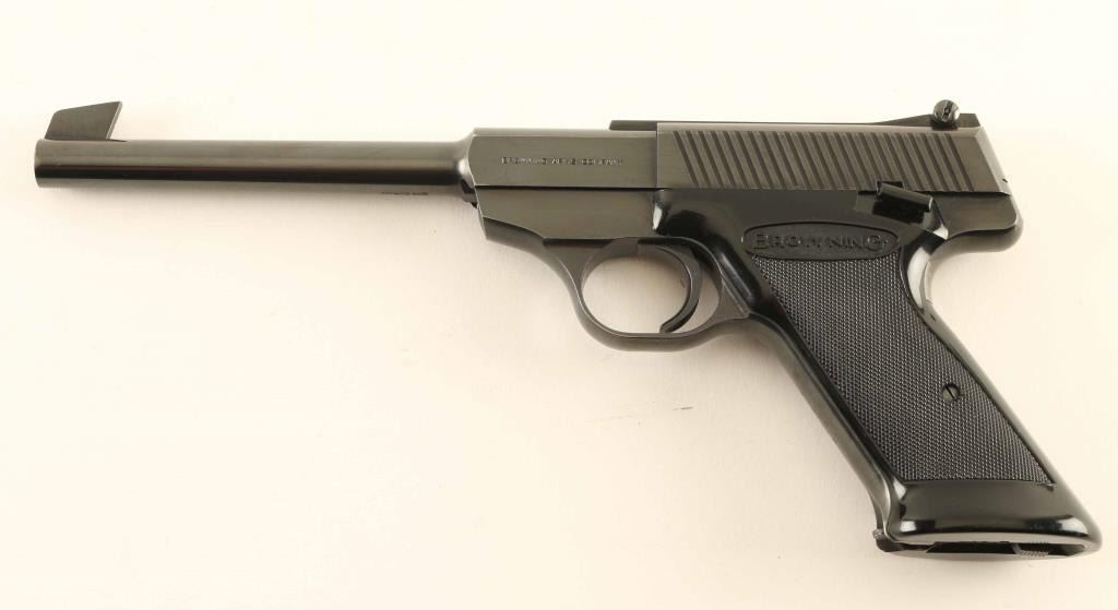 Belgian made single action semi automatic target pistol chambered in 22 long rifle, manufactured circa 1968. Features a blued/black finish, 6 3/4" barrel, ramped patridge front sight, adjustable rear sight, smooth wide trigger, manual safety on the left side of the frame, heel magazine release, factory 10 round magazine, alloy frame, and a one-piece black plastic wrap-around grip with Browning decor. Pistol displays approximately 97% of its original finish showing a some dings and light handling marks. Action is very smooth, the bore is excellent and the black plastic grip is very good. Condition is near NRA Excellent. ***C&R Firearm***