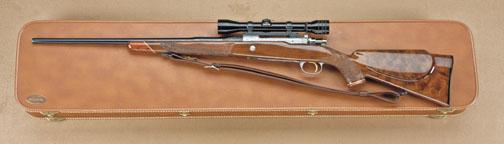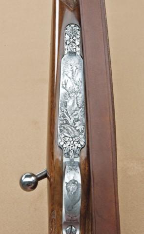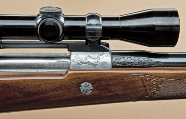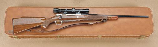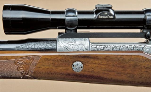 Browning Olympian bolt-action sporting rifle, Belgian made, .30-06 caliber, fully and finely factory engraved in game scenes with select checkered burl walnut stocks, serial #1X6809. Mounted with Redfield 4x scope on Redfield mounts, quick detachable sling swivels, quick sling, with luggage type case. The engraving is signed “Marechal” including antelope, bear, elk, and deer. The rifle is in fine to excellent original condition showing 98-99% plus original blue, slight handling and use only, interior shows very little use and near excellent overall with original paperwork, manual, and factory information. Purchased from Kerr’s of Beverly Hills, December 1963. From the Robert Petersen estate. Est: $2,000 - $4,000