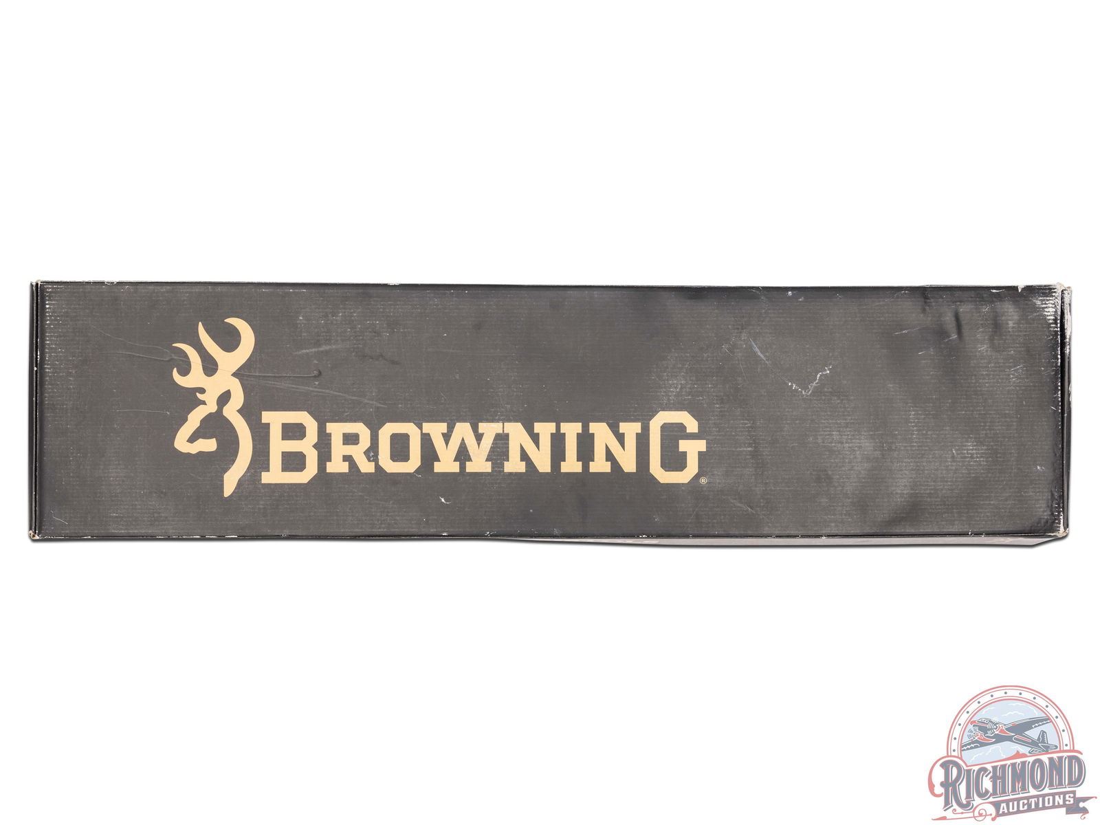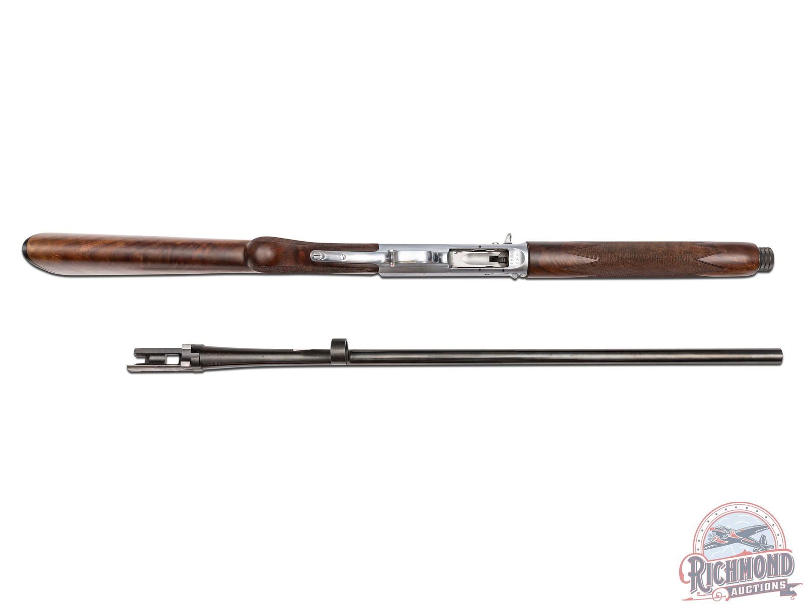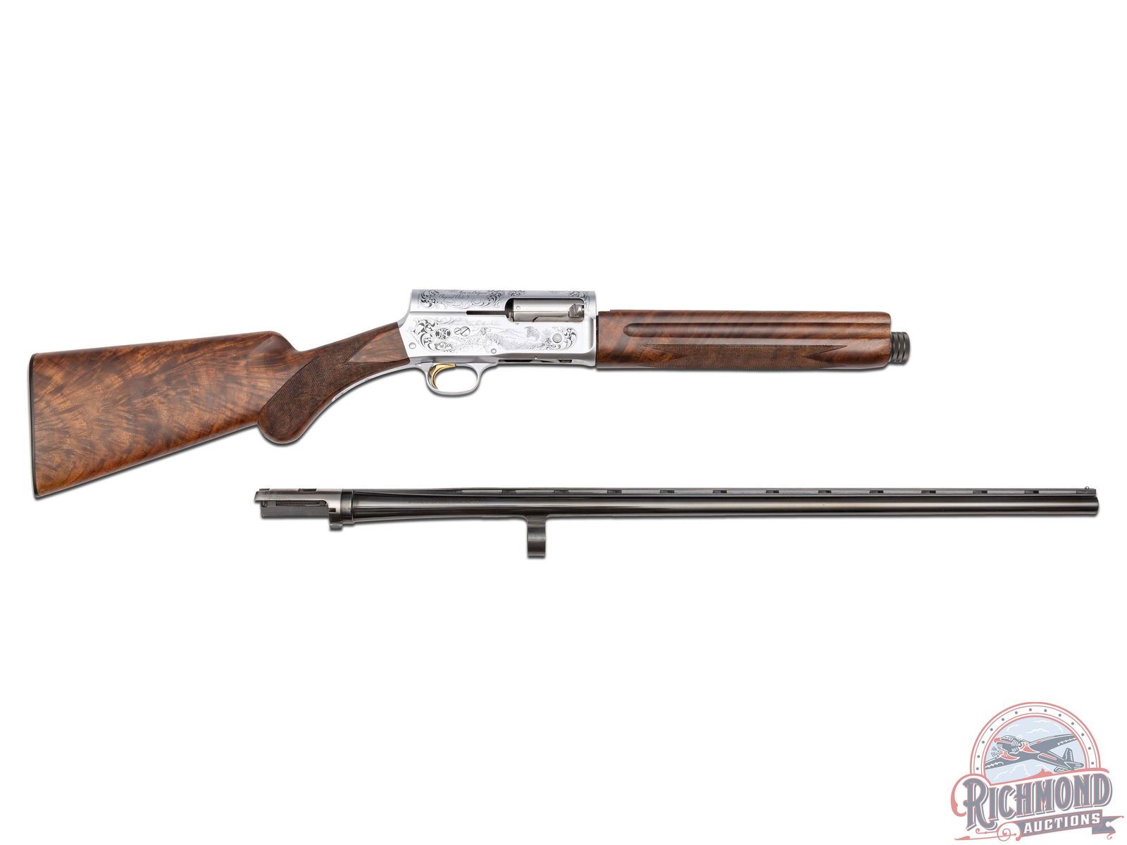 Manufactured in Belgium FN Custom Shop for Browning. Features a 28" blued ventilated rib barrel chambered for 3" shells with Improved Cylinder choke and nickel bead front sight. Coin finished receiver with Browning Custom Shop engraving. Top of the receiver features floral scroll designs with the left stamped "LIMITED EDITION" and the right stamped "ORIGINAL AUTO 5 / MADE IN BELGIUM". Left side features a woodcock in flight and setter in a field scene with floral scroll design on each side and signed by engraver at the bottom "ROMAINVILLE B.". Right side features a woodcock in flight and setter in a field scene with floral scroll design on each side along with a large FN logo. Crossbolt safety and gold washed trigger. Grade IV walnut round knob, long tang stock with checkered pistol grip and matching skeet style forearm with checkering. Fitted with a factory butt plate. Comes in a nice Emmebi burgundy velvet lined leather Browning Custom Shop take-down case with factory paperwork. Includes original Browning box as well. LOP: 14". DAC: 1-1/2". DAH: 2-1/4". CALIBER: 20 GA. S/N: 161CS01643. FFL STATUS: Modern.