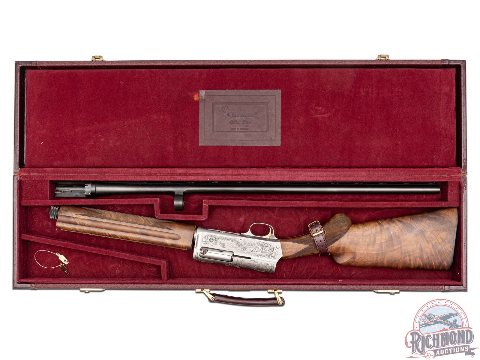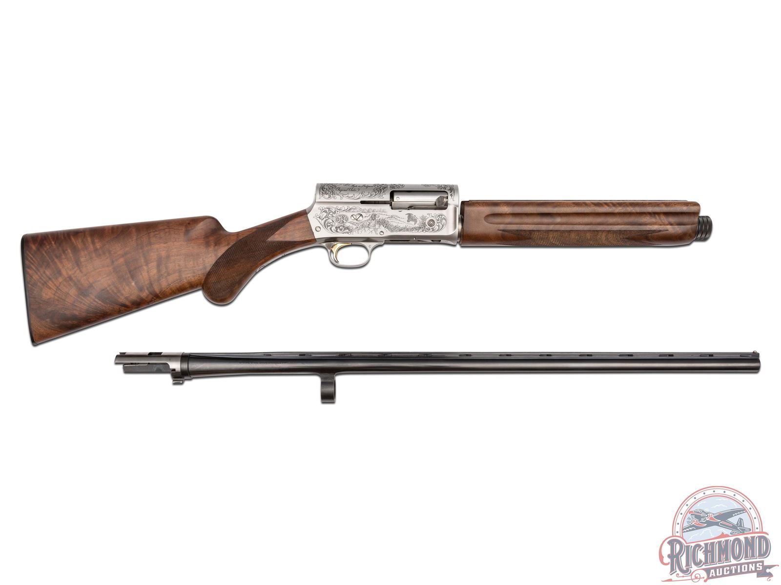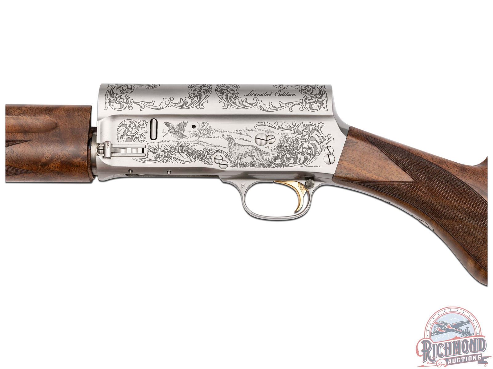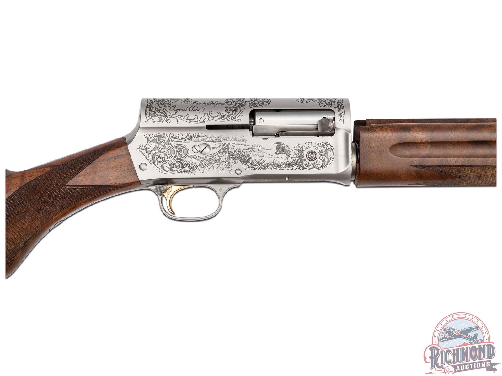 Manufactured in Belgium FN Custom Shop for Browning. Features a 28" blued ventilated rib barrel chambered for 2-3/4" shells with Improved Cylinder choke and nickel bead front sight. Coin finished receiver with Browning Custom Shop engraving. Top of the receiver features floral scroll designs with the left stamped "LIMITED EDITION" and the right stamped "ORIGINAL AUTO 5 / MADE IN BELGIUM". Left side features a woodcock in flight and setter in a field scene with floral scroll design on each side and signed by engraver at the bottom "ROMAINVILLE B.". Right side features a woodcock in flight and setter in a field scene with floral scroll design on each side along with a large FN logo. Crossbolt safety and gold washed trigger. Grade IV walnut round knob, long tang stock with checkered pistol grip and matching skeet style forearm with checkering. Fitted with a factory butt plate. Comes in a nice Emmebi burgundy velvet lined leather Browning Custom Shop take-down case. Includes original Browning box as well. LOP: 14". DAC: 1-1/2". DAH: 2-1/4". CALIBER: 20 GA. S/N: 231CS01471. FFL STATUS: Modern.