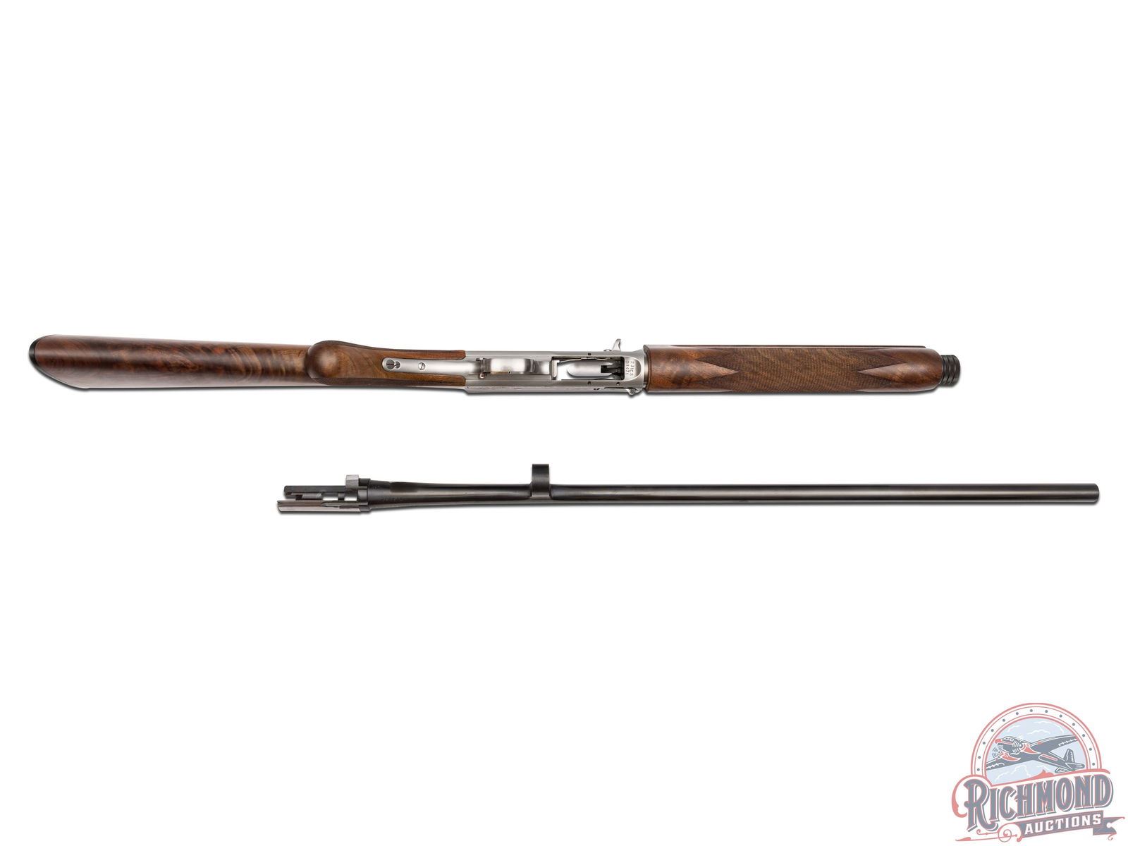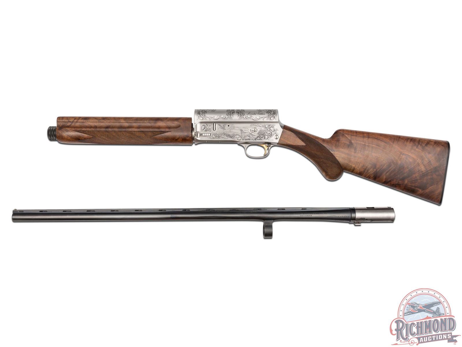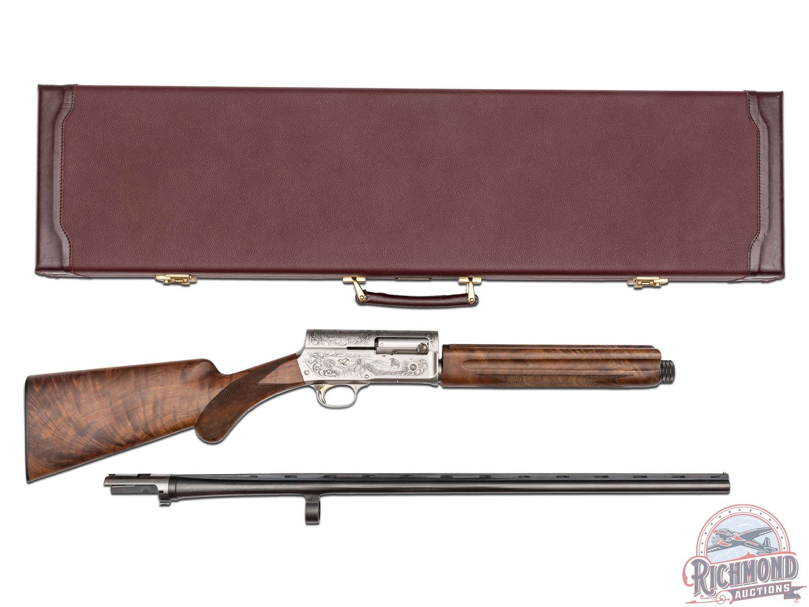 Manufactured in Belgium FN Custom Shop for Browning. Features a 28" blued ventilated rib barrel chambered for 2-3/4" shells with Improved Cylinder choke and nickel bead front sight. Coin finished receiver with Browning Custom Shop engraving. Top of the receiver features floral scroll designs with the left stamped "LIMITED EDITION" and the right stamped "ORIGINAL AUTO 5 / MADE IN BELGIUM". Left side features a woodcock in flight and setter in a field scene with floral scroll design on each side and signed by engraver at the bottom "ROMAINVILLE B.". Right side features a woodcock in flight and setter in a field scene with floral scroll design on each side along with a large FN logo. Crossbolt safety and gold washed trigger. Grade IV walnut round knob, long tang stock with checkered pistol grip and matching skeet style forearm with checkering. Fitted with a factory butt plate. Comes in a nice Emmebi burgundy velvet lined leather Browning Custom Shop take-down case. Includes original Browning box as well. LOP: 14". DAC: 1-1/2". DAH: 2-1/4". CALIBER: 20 GA. S/N: 231CS01471. FFL STATUS: Modern.