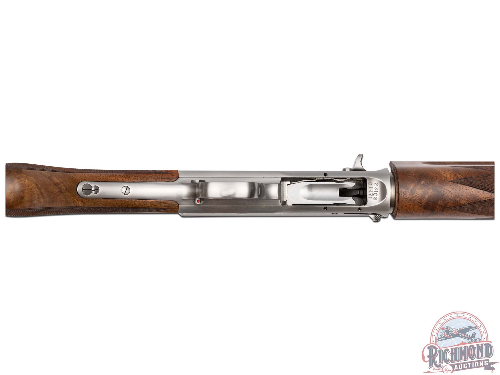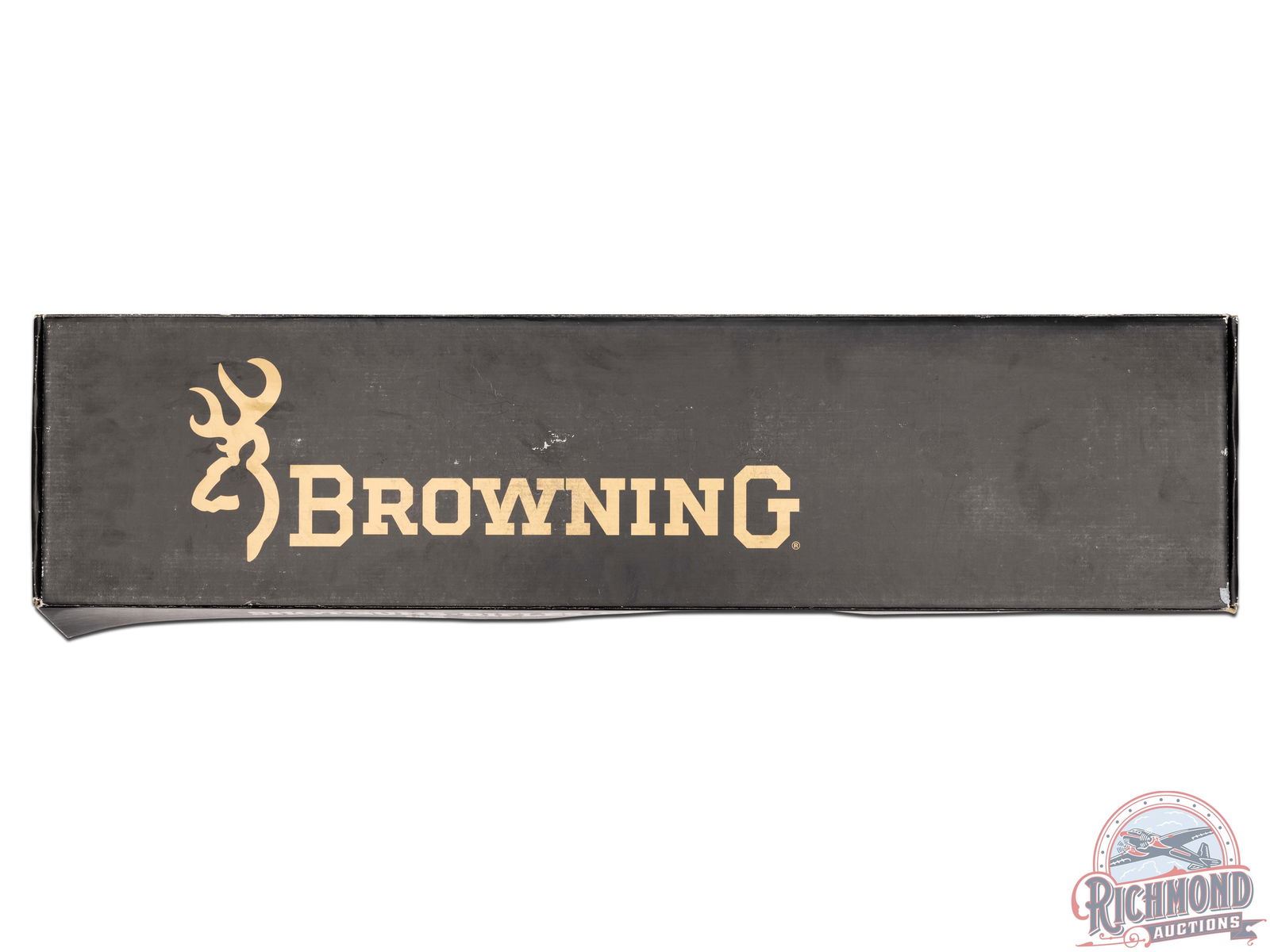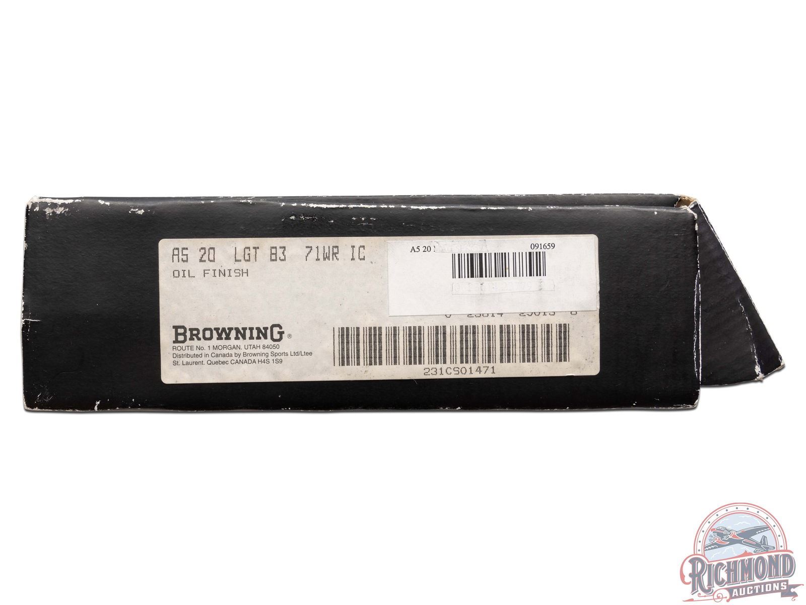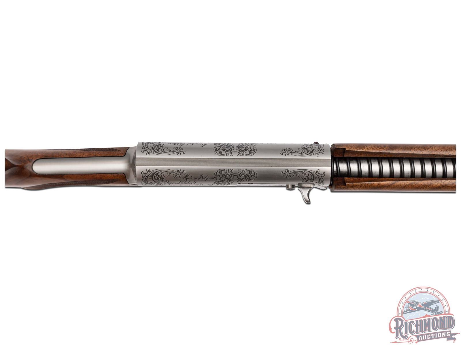Manufactured in Belgium FN Custom Shop for Browning. Features a 28" blued ventilated rib barrel chambered for 2-3/4" shells with Improved Cylinder choke and nickel bead front sight. Coin finished receiver with Browning Custom Shop engraving. Top of the receiver features floral scroll designs with the left stamped "LIMITED EDITION" and the right stamped "ORIGINAL AUTO 5 / MADE IN BELGIUM". Left side features a woodcock in flight and setter in a field scene with floral scroll design on each side and signed by engraver at the bottom "ROMAINVILLE B.". Right side features a woodcock in flight and setter in a field scene with floral scroll design on each side along with a large FN logo. Crossbolt safety and gold washed trigger. Grade IV walnut round knob, long tang stock with checkered pistol grip and matching skeet style forearm with checkering. Fitted with a factory butt plate. Comes in a nice Emmebi burgundy velvet lined leather Browning Custom Shop take-down case. Includes original Browning box as well. LOP: 14". DAC: 1-1/2". DAH: 2-1/4". CALIBER: 20 GA. S/N: 231CS01471. FFL STATUS: Modern.