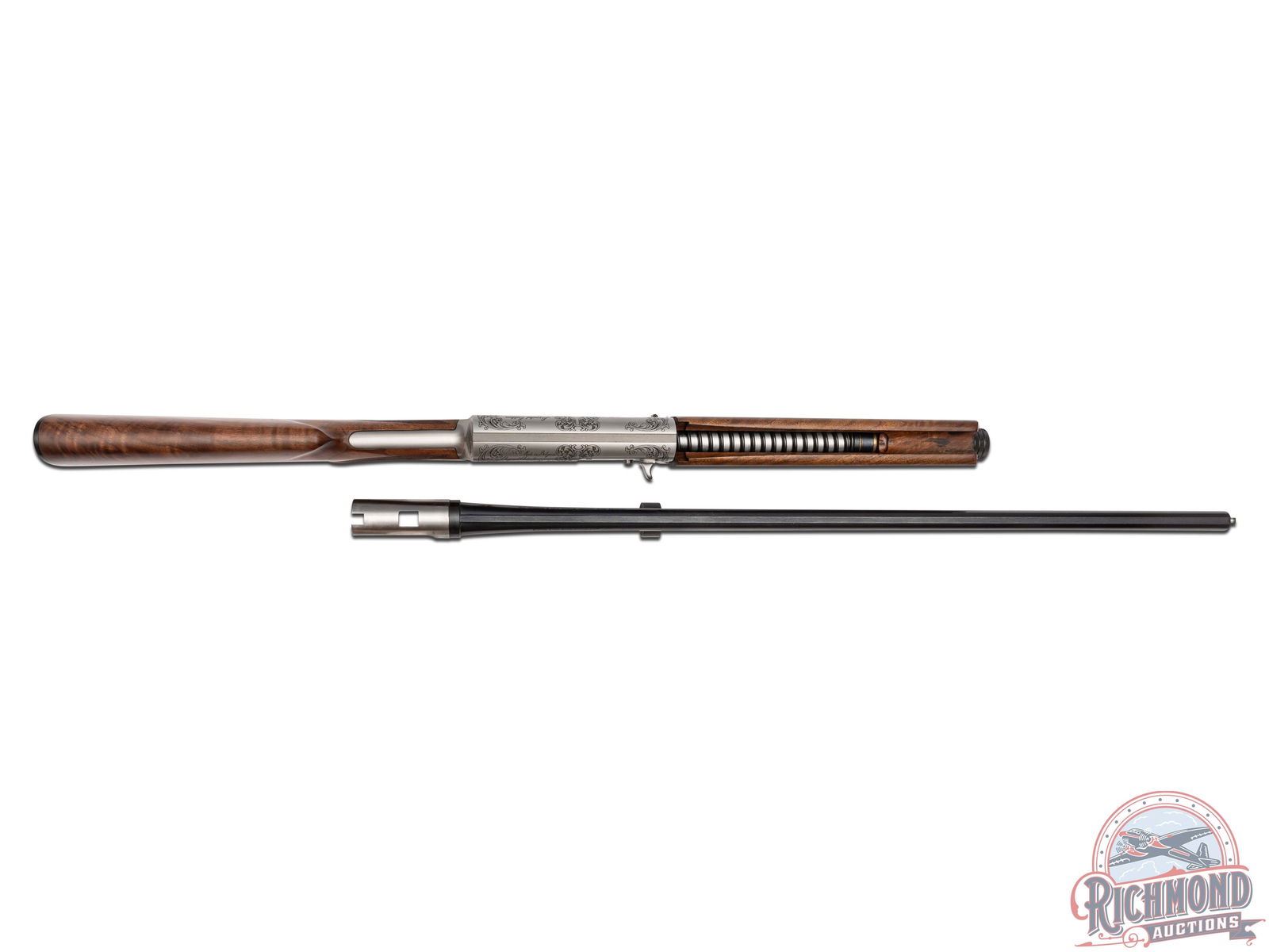 Lots 590 through 596 are scarce and mysterious examples of one of the company’s most legendary shotguns, the Auto-5, which John Browning even called his greatest achievement. After A5 production ended in 1998, it is believed that some spare parts were uncovered, leading Browning’s Custom Shop to create a very limited quantity of these A5 models. The only known examples are in 20 Gauge and 12 Gauge, each available in a Light and Magnum variation. To add more mystery, these variations were engraved with B3 and B4 patterns. While exact production numbers remain uncertain and are a topic of discussion among serious collectors, it is rumored that some of the gauge and engraving patterns featured here may have fewer than five known existing examples. If only eight total gauge and engraving patterns were produced, this offering of seven presents the most complete collection to hit the market at one time.