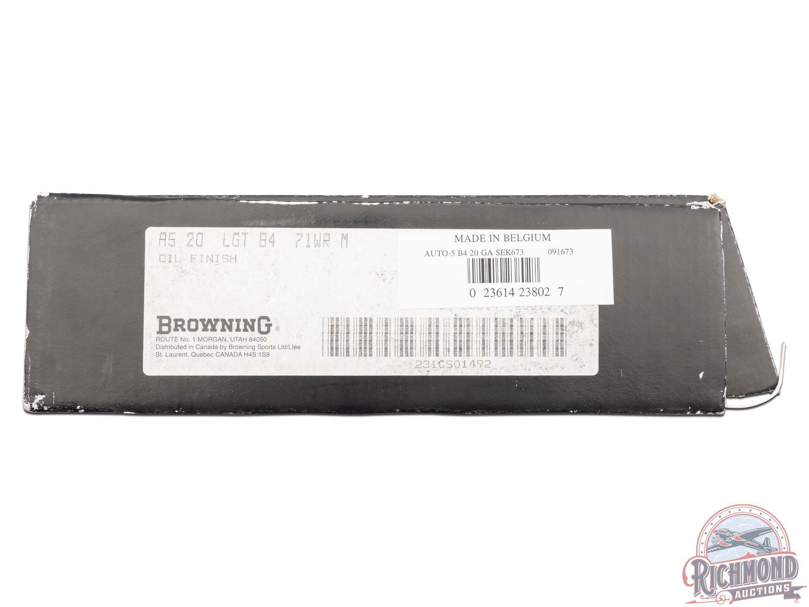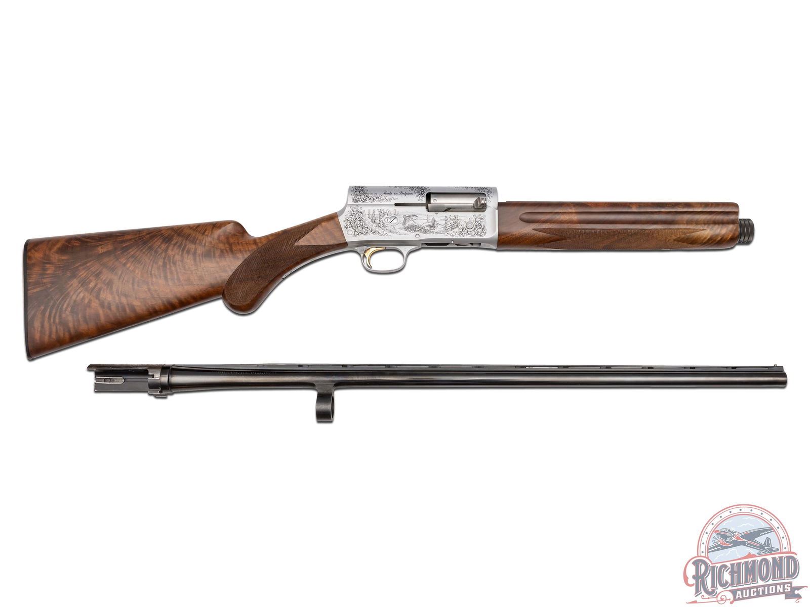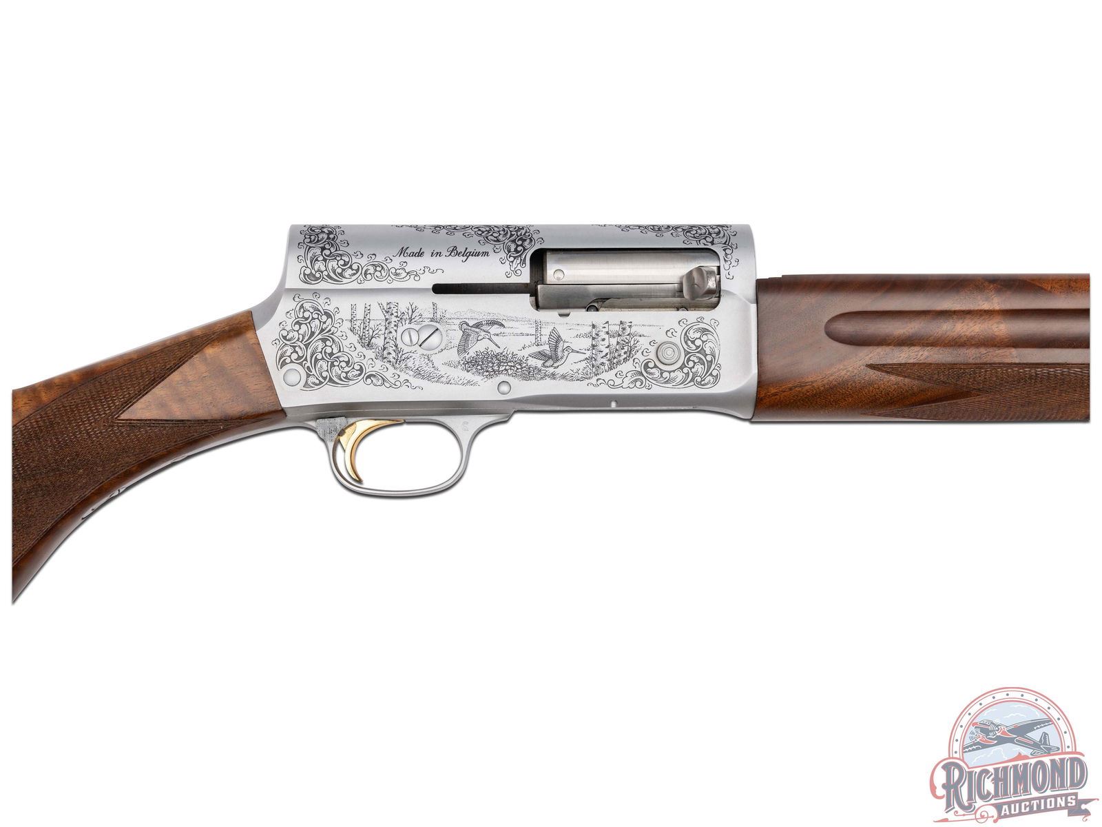 Manufactured in Belgium FN Custom Shop for Browning. Features a 28" blued ventilated rib barrel chambered for 2-3/4" shells with Improved Modified choke and nickel bead front sight. Coin finished receiver with Browning Custom Shop engraving. Top of the receiver features floral scroll designs with the left stamped "ORIGINAL AUTO 5" and right "MADE IN BELGIUM". Left side features several grouse in a field scene with a floral scroll design on each side and signed by engraver at the bottom "ROMAINVILLE B.". Right side features two woodcocks in flight in a woodland scene with floral scroll design on each side. Crossbolt safety and gold washed trigger. Grade IV walnut round knob, long tang stock with checkered pistol grip and matching skeet style forearm with checkering and satin oil finish. Fitted with a factory black plastic checkered butt plate. Comes in a nice Emmebi burgundy velvet lined leather Browning Custom Shop take-down case with factory Custom Shop paperwork and cable lock. Includes original Browning box and shipping box as well. LOP: 14". DAC: 1-1/2". DAH: 2-1/4". CALIBER: 20 GA. S/N: 231CS01492. FFL STATUS: Modern.
