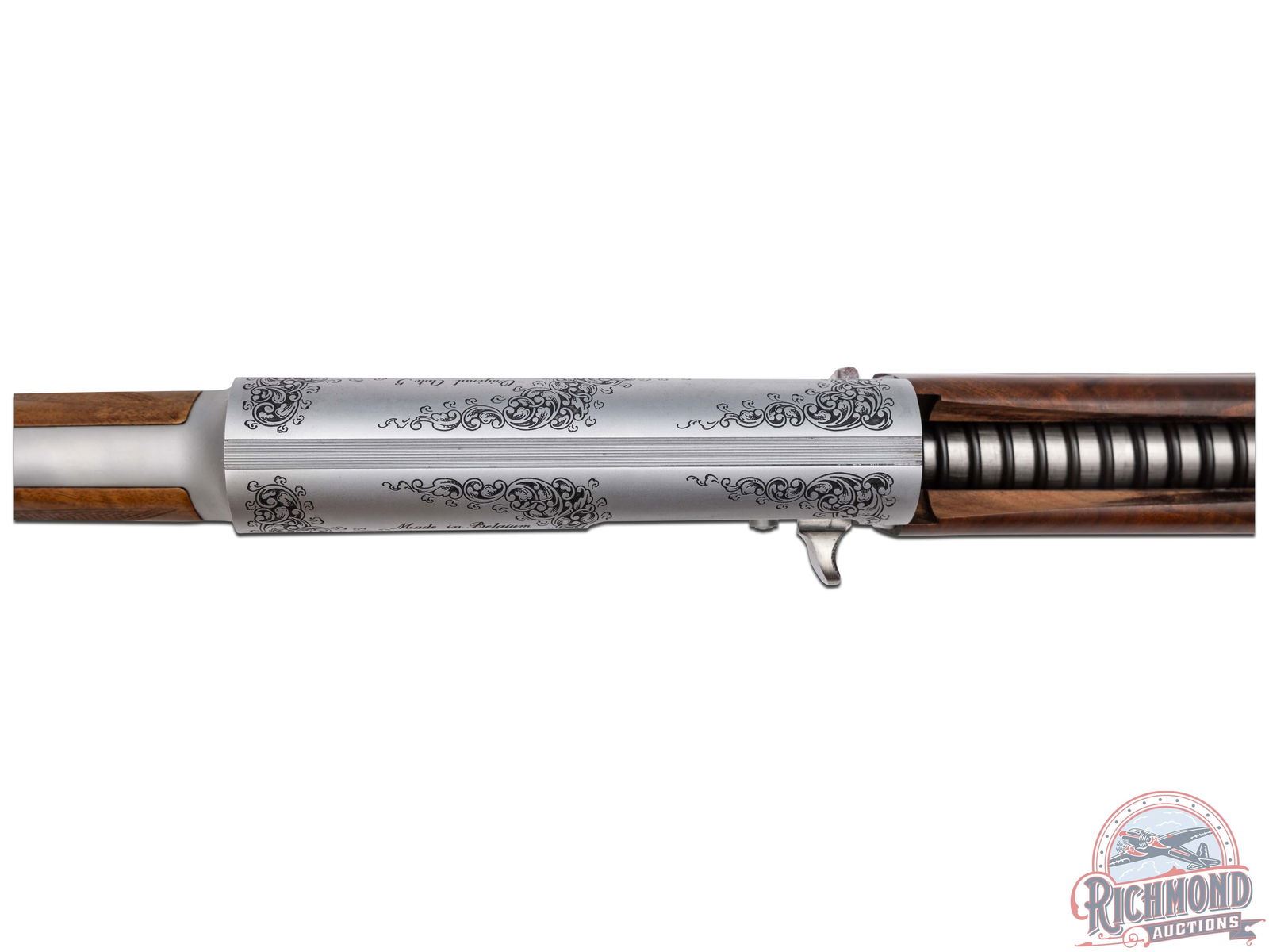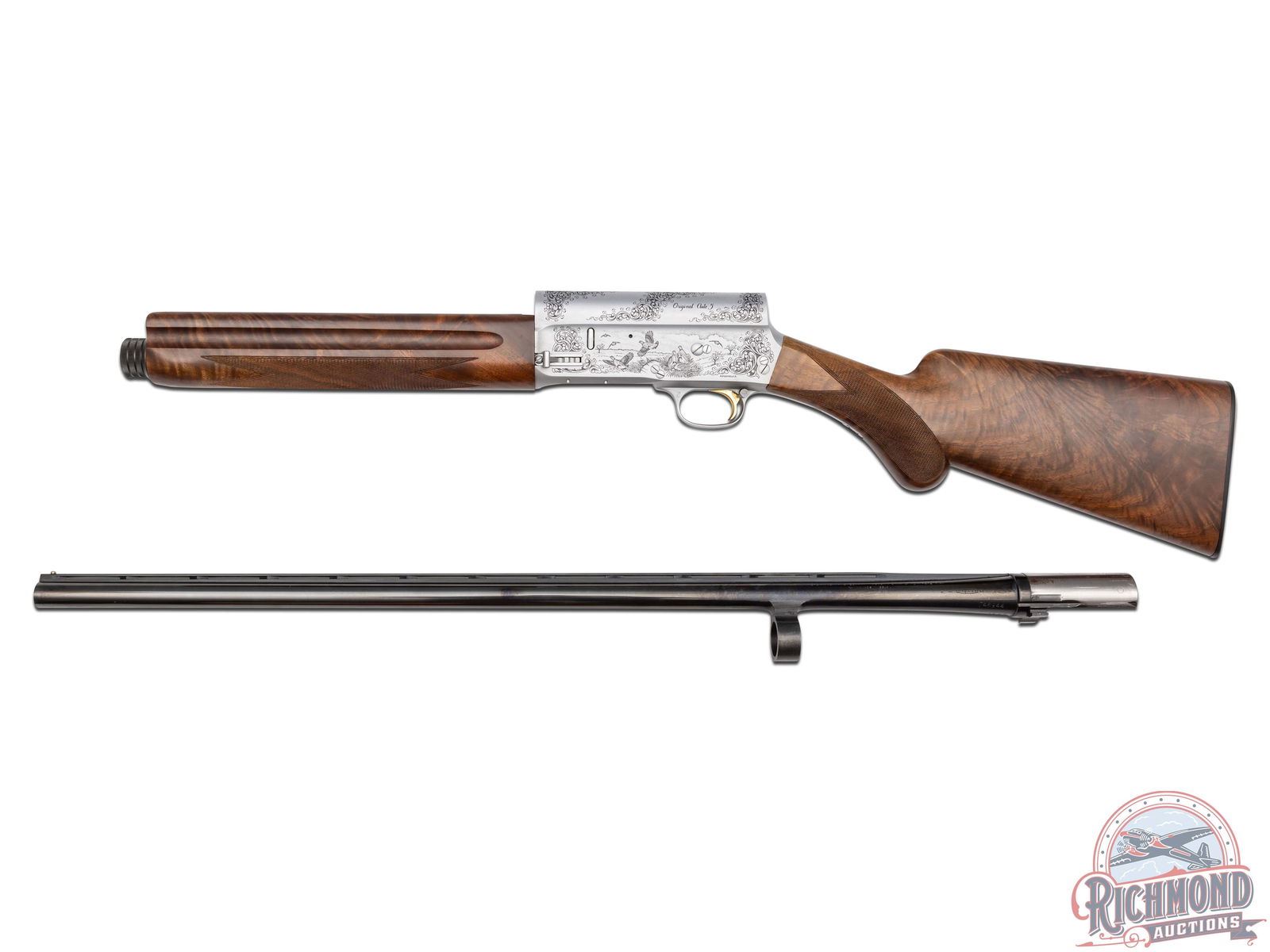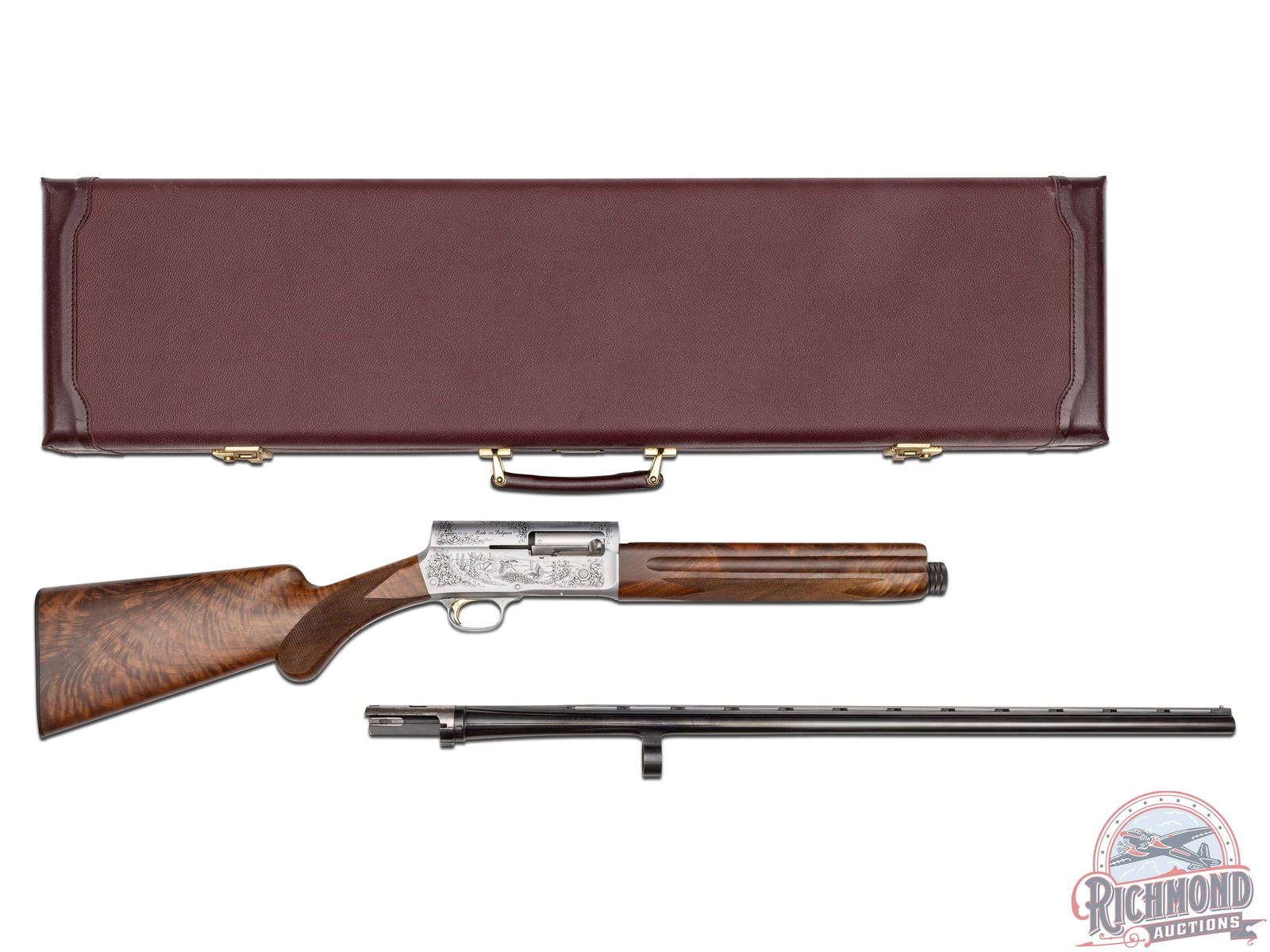 Lots 590 through 596 are scarce and mysterious examples of one of the company’s most legendary shotguns, the Auto-5, which John Browning even called his greatest achievement. After A5 production ended in 1998, it is believed that some spare parts were uncovered, leading Browning’s Custom Shop to create a very limited quantity of these A5 models. The only known examples are in 20 Gauge and 12 Gauge, each available in a Light and Magnum variation. To add more mystery, these variations were engraved with B3 and B4 patterns. While exact production numbers remain uncertain and are a topic of discussion among serious collectors, it is rumored that some of the gauge and engraving patterns featured here may have fewer than five known existing examples. If only eight total gauge and engraving patterns were produced, this offering of seven presents the most complete collection to hit the market at one time.