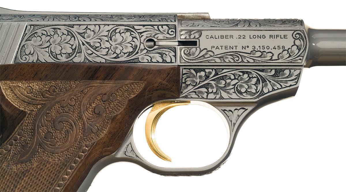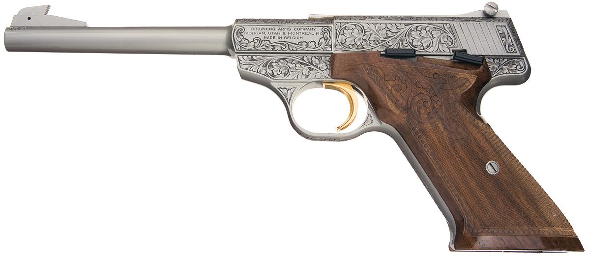 Manufactured in Belgium from 1962 to 1974. This version of the Browning Challenger pistol features the Renaissance factory engraving, a scroll floral engraving that is extensively featured on the slide and sides of the frame. The engraving surrounds the two line address/"MADE IN BELGIUM" marking on the left side of the chamber as well as the two line caliber/patent marking on the reverse. The engraving is also featured very lightly around the ramp blade front sight, on the trigger guard, and surrounding the serial number on the front grip strap. Fitted with checkered and scroll carved grips.