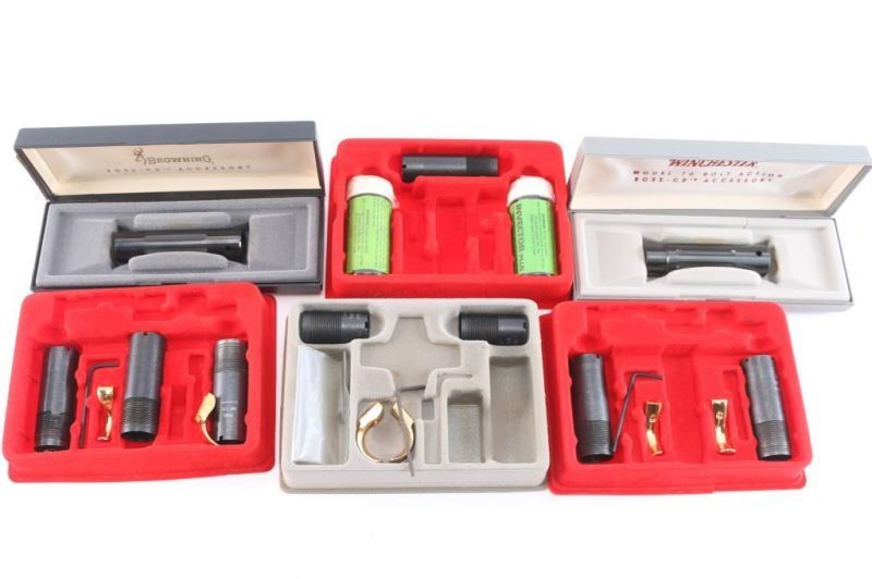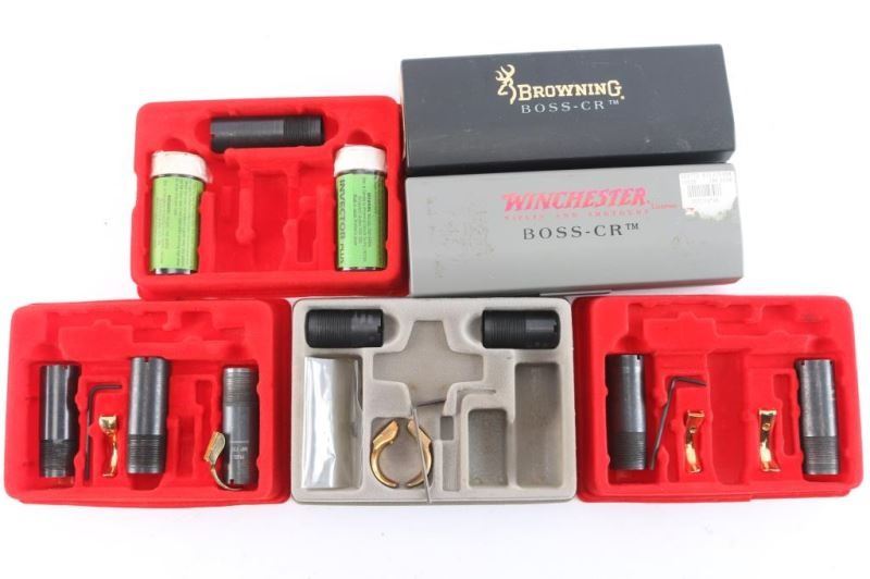 Includes: 2 - 'BOSS-CR Accessory' muzzle brakes, M-70 75/125 w/instructions and case, the other is for a Browning 80/90 w/case. Both in very good condition; 4 - sets of choke tubes for 12 Gauge, various sizes and gold-plated triggers. All in good condition.