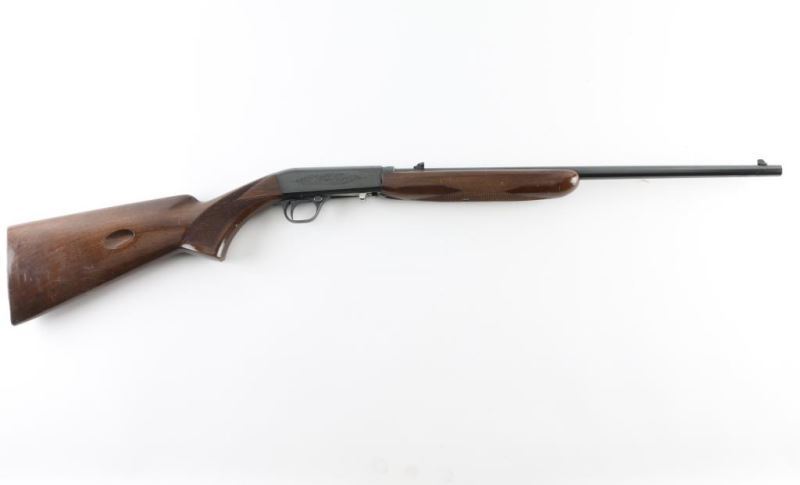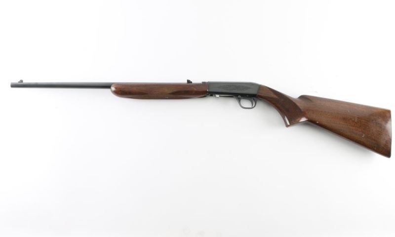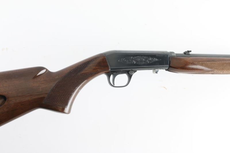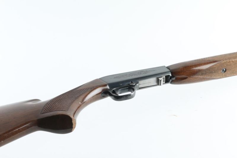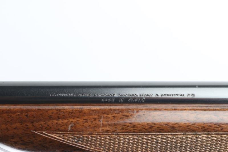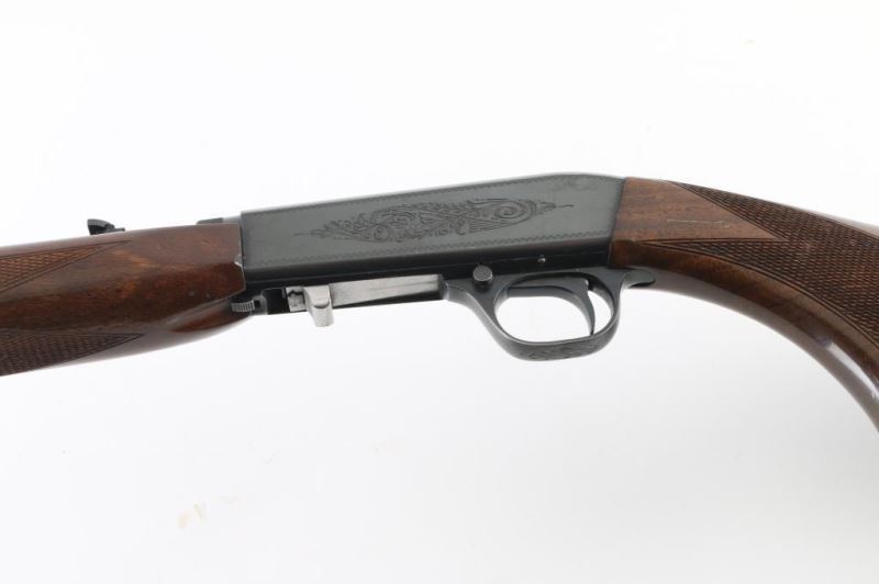 Semiautomatic rifle manufactured in Japan by Miroku. Grade I. Manufactured 1978. Imported for Browning Arms Company of Morgan, Utah/Montreal P.Q. Features a high-polish blued finish, light coverage floral scroll engraving, Belgium proofs present. 19 1/4" take-down barrel, post/bead front sight with brass bead, elevation adjustable folding leaf rear sight, tubular magazine in butt, smooth trigger, push button safety, serrated charging knob on the underside of the bolt, checkered walnut forend with high gloss finish and semi-pistol grip shoulder stock with serrated metal buttplate. Barrel drilled/tapped for optics (No screws) Bore appears very good/bright, but dirty. Retains 96% polished blue with minor scratches. There is a spot of pin-prick pitting on top of the receiver. Wood is good with minor scratches/dings. NRA Condition-Very Good. Modern Firearm.