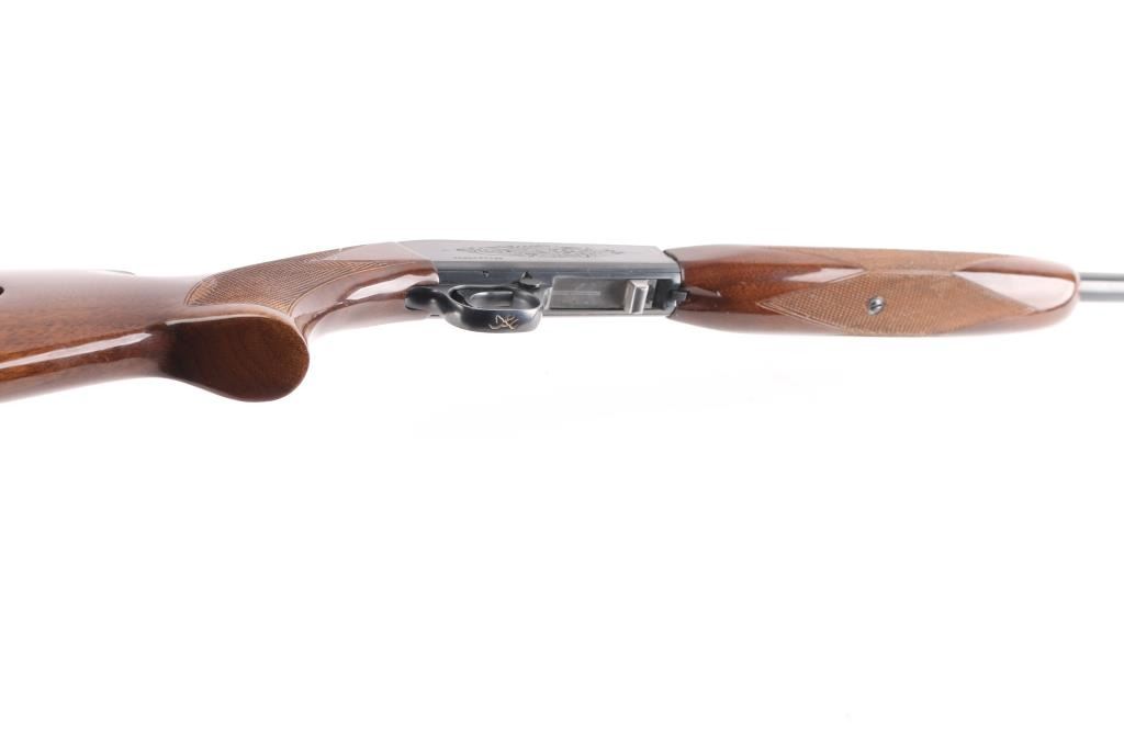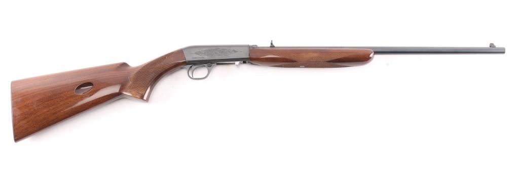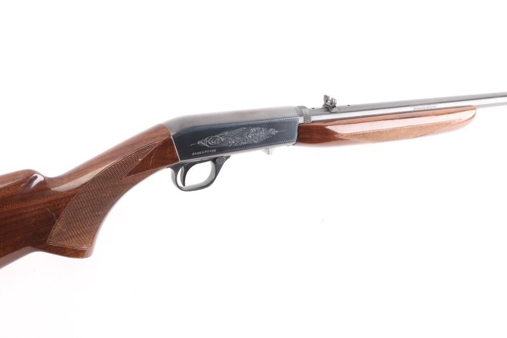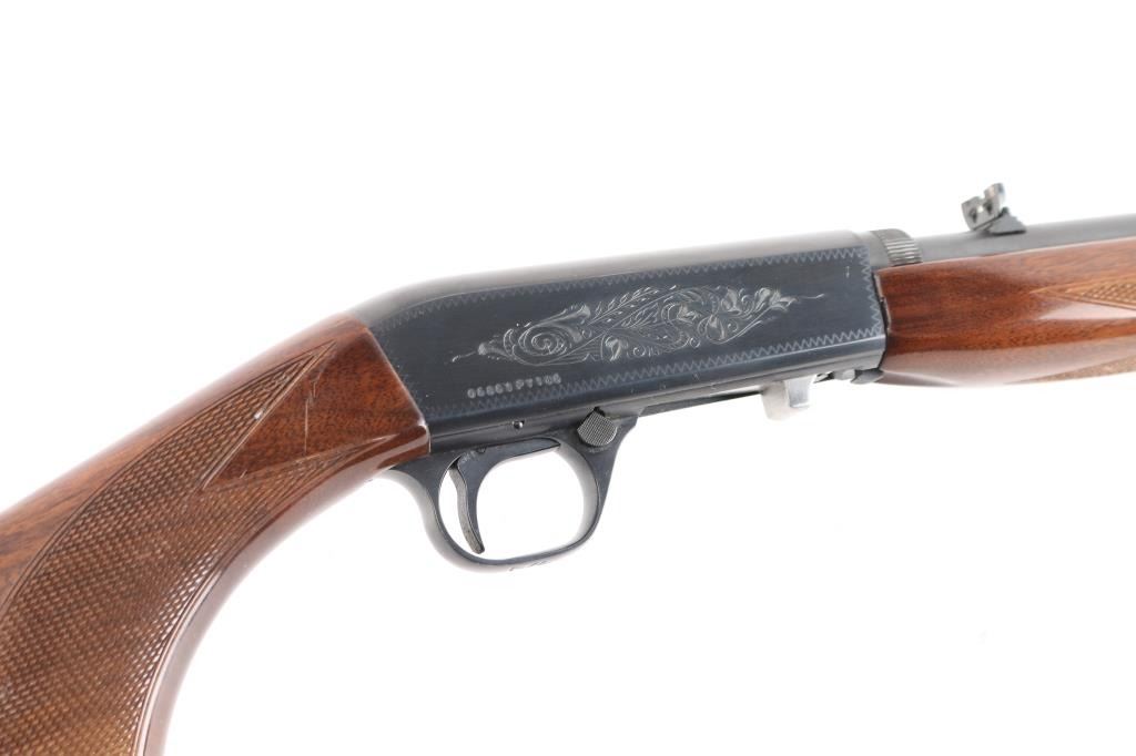 "Grade I" Semiautomatic rifle made in Japan for Browning Arms Co, Morgan UT. Features take-down latch, blued finish, checkered walnut butt & forend, 19" barrel, blade front sight with brass bead, adjustable sporting flip-up rear sight, magazine tube in butt, serrated steel buttplate, push button safety. Receiver is engraved with limited coverage of floral scrolls and edge patterns, barrel is tapped and drilled, instead of receiver, to mount an optic and to prevent shift in zero after reassembly. Retains approximately 98% finish with little to no scratches, wood is excellent with high gloss and little scratch on the right side of stock grip. Bore is excellent, a little dirty.