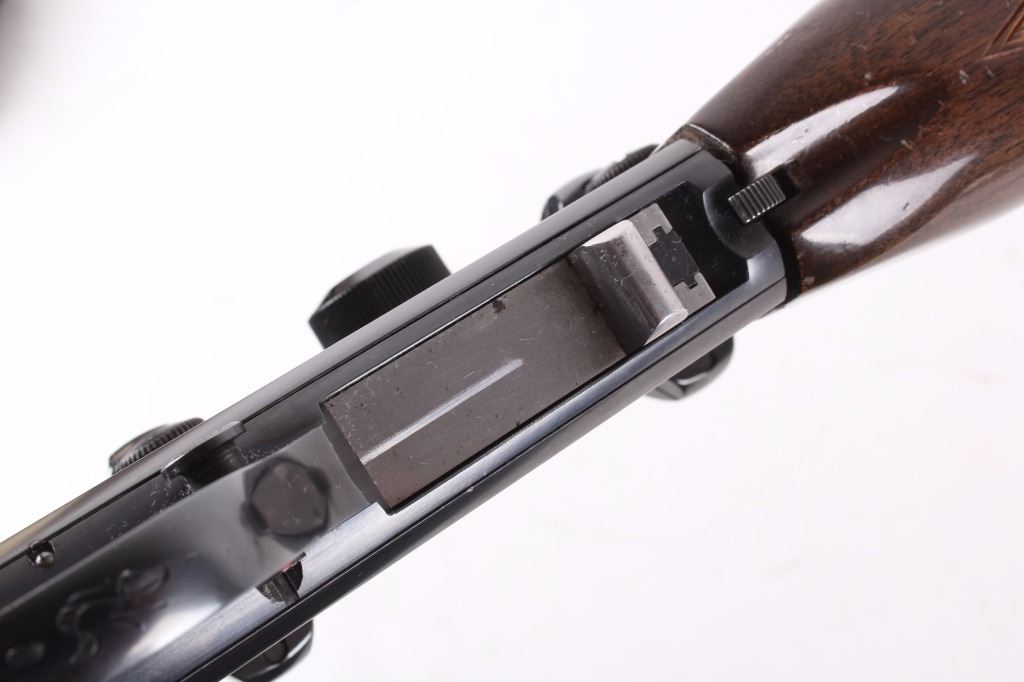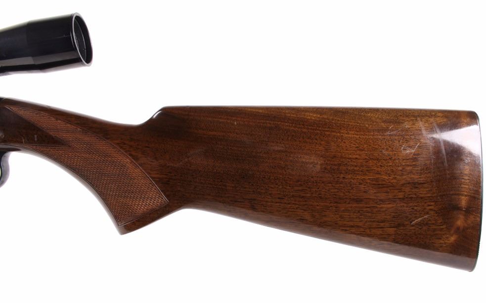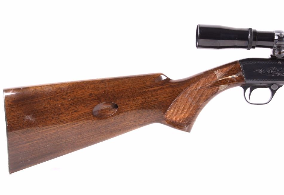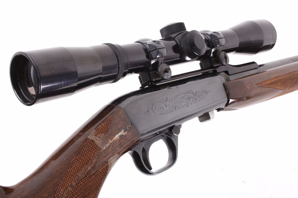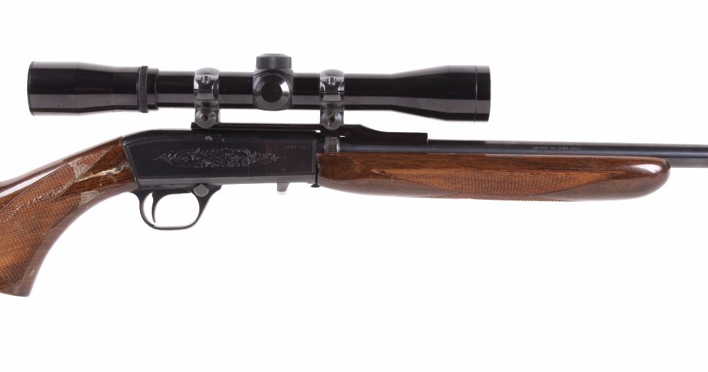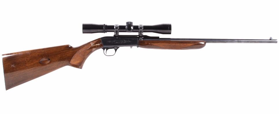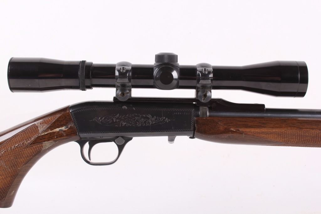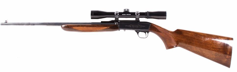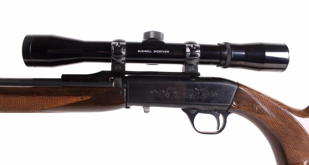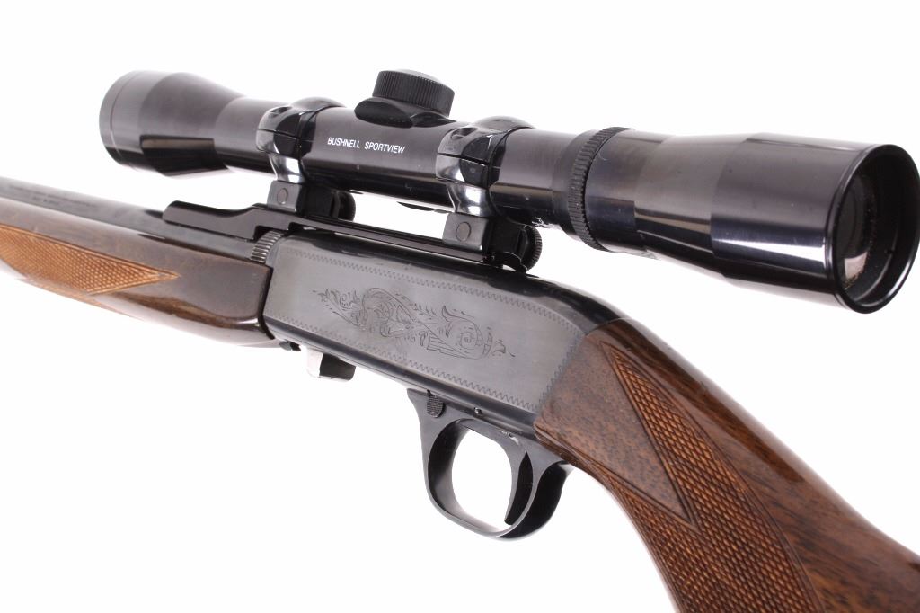 Available for sale is a Browning SA-22 LR semi auto rifle with Bushnell scope. The rifle features a 95% blued finish, 19" barrel, stock tube magazine, downward ejection, and fine walnut stock. The SA-22 was the first production semiautomatic rifle chambered in .22 LR caliber, and is regarded as a classic firearm. It has been offered in several "grades" of engraving and gold inlay, and is a widely collected gun. This rifle is in good condition with excellent bluing, but grip does show repair and the wood shows hadling wear. Rifle is marked on the barrel "Browning Arms Company Morgan Utah & Montreal P.Q Made in Japan Caliber .22 Long Rifle Browning Patents." Modern rifle. FFL transfer or NICS background check required. Serial number is 06941T57.