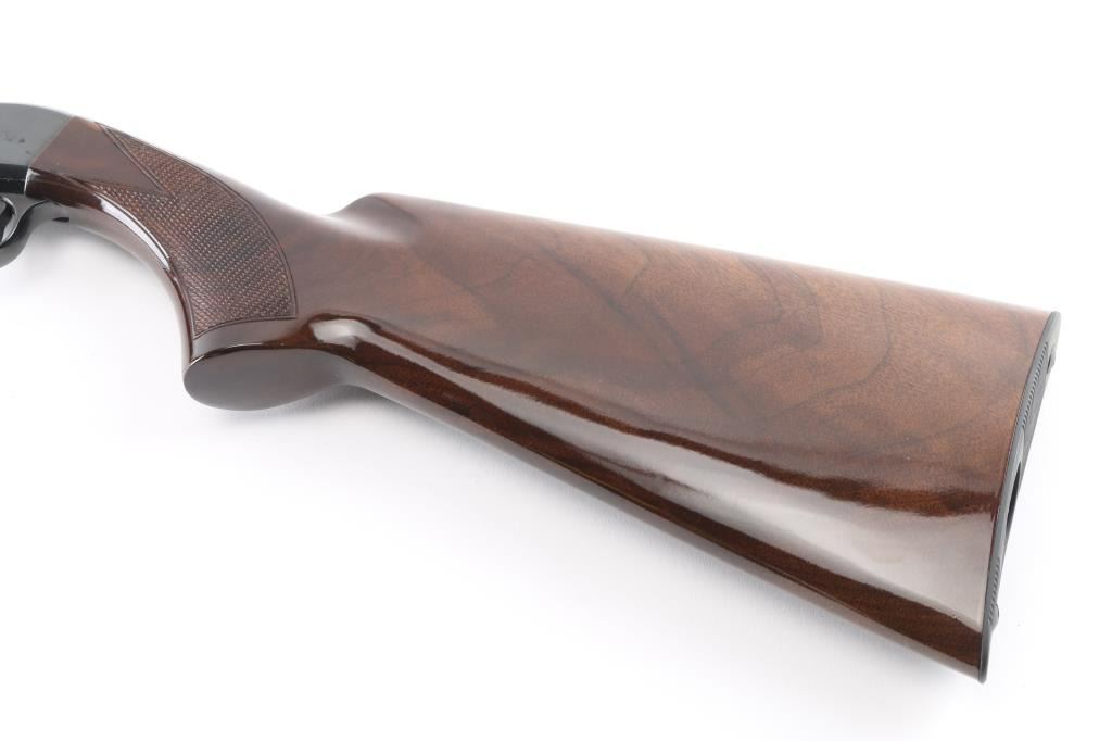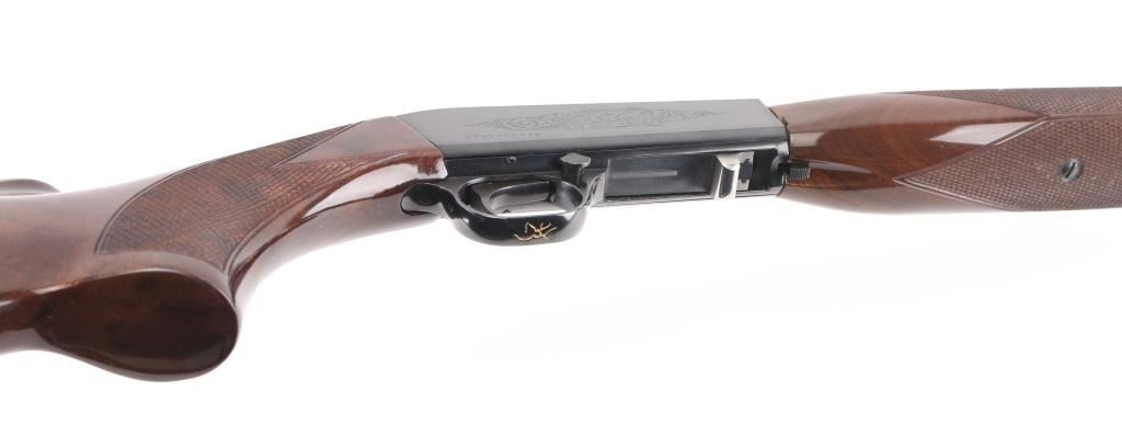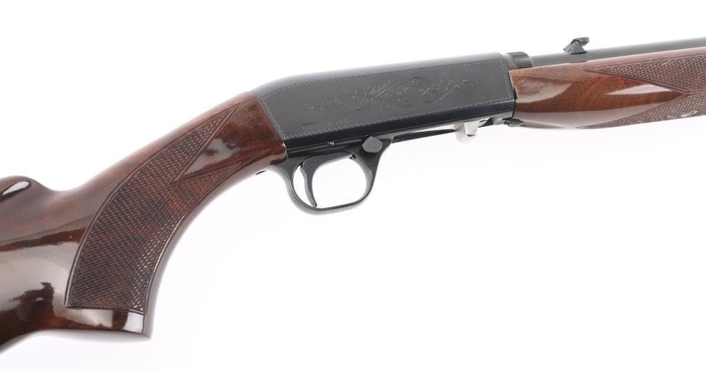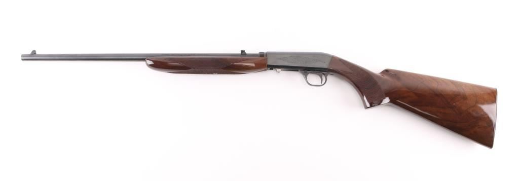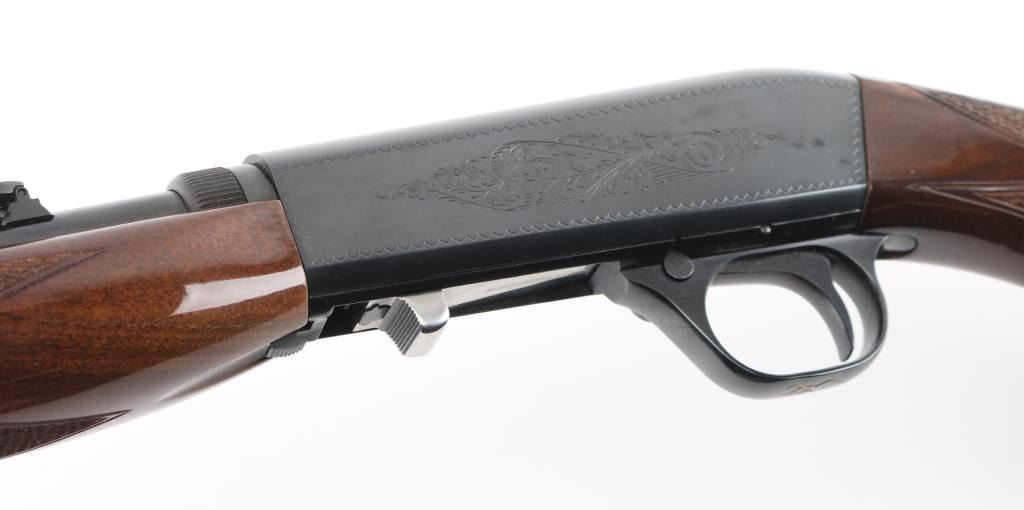 Semiautomatic rifle made in Japan for Browning Arms Co, Morgan UT. Features take-down latch, blued finish, checkered walnut butt & forend, 19" barrel, blade front sight, folding adjustable rear sight, magazine tube in butt, grooved steel buttplate, manual safety. Receiver is engraved with limited coverage of floral scrolls and edge patterns. Bore is very good condition. Retains 95% blued finish with handling marks. Wood is very good condition with few scratches. Condition is NRA Excellent *** Modern Firearm ***