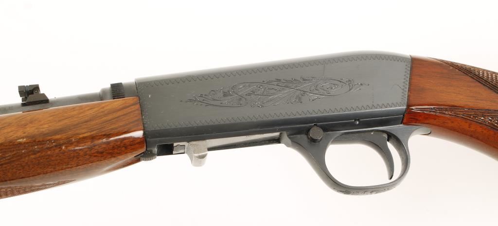 Semi-auto Belgium made Grade-II rimfire rifle. 19" blued barrel in excellent condition with a shiny bore and good rifling. Walnut stock is in very good condition with only minor scratches. Receiver and action appear to be in excellent shape Condition is Very Good. Modern FIrearm