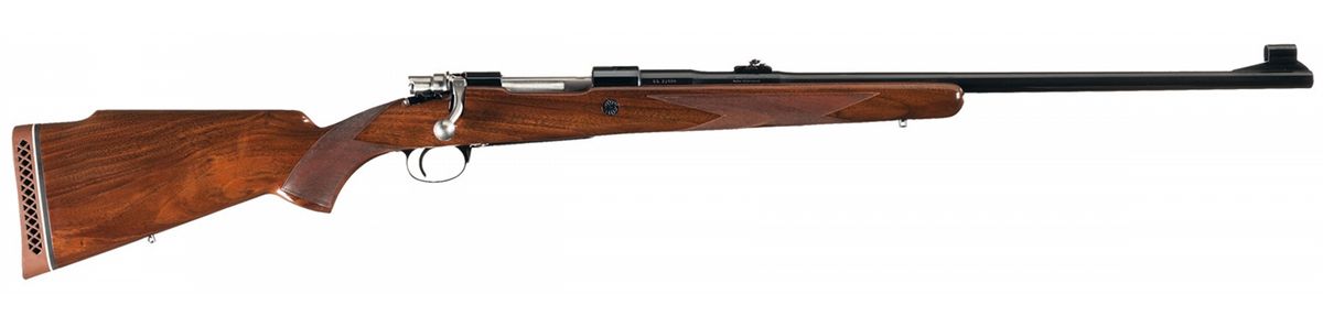 Manufactured in Belgium. Standard markings with Belgian proofs. Hooded ramp front and adjustable leaf rear sight. Receiver tapped for scope mounting. With light gold filled scroll engraving on floor plate and trigger guard. Checkered forearm and pistol grip stock with vented factory recoil pad.