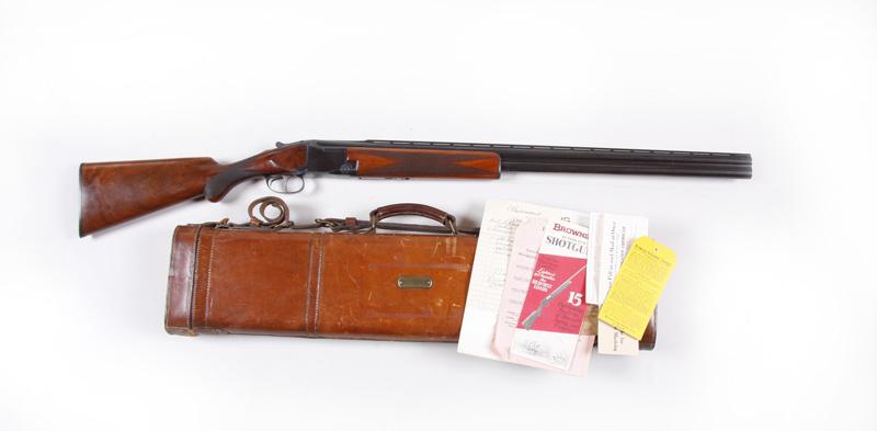 Browning Superposed 12 ga SN:1633 Exceptional early Superposed Over/Under Trap Grade shotgun made in Belgium. Blued finish, walnut checkered semi pistol grip stock with round knob, hard rubber butt plate with "Browning Superposed" molded into circles, anExceptional early Superposed Over/Under Trap Grade shotgun made in Belgium. Blued finish, walnut checkered semi pistol grip stock with round knob, hard rubber butt plate with "Browning Superposed" molded into circles, and with checkered fore arm,30" barrels with vent rib, double hammers, good bores and action. Condition: Excellent with just a hint of finish thinning on the receiver. Includes original paperwork showing letter about the order for thegun in 1936. What a beauty!