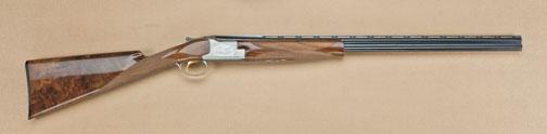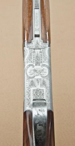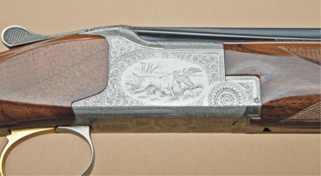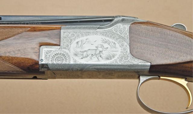 Browning Superposed 410ga superlight over/under shotgun, Belgian made, pointer grade, 28” barrels, single trigger, auto ejector, English style straight stock, choked modified and full, like new in original box showing just slight evidence of firing and almost no use. 99% to near new. The gun shows nicely engraved scenes of hunting dogs with birds. The left rear of the receiver is signed by engraver “E. Vos”. The gun is contained with its original cardboard box, shows some tatters and losses to the label. A scarce combination of desirable features. Serial #460J83. From the Robert Petersen estate. Est: $3,500 - $7,000