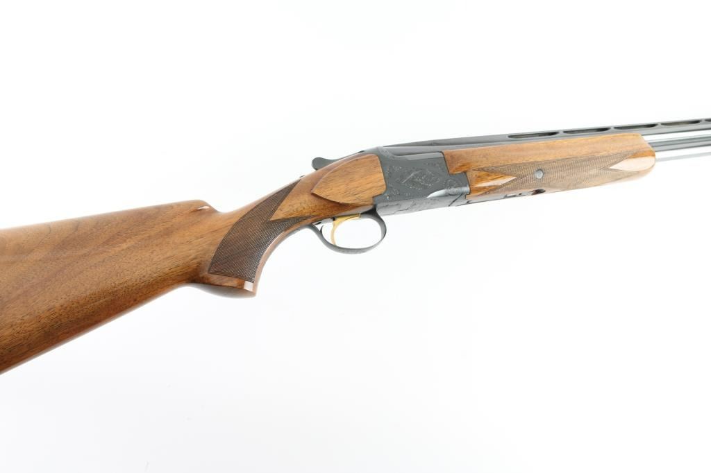 SN: 15868S3 Belgian Over / Under shotgun imported by Browning Arms Co, St Louis MO, circa 1963. Takes 2-3/4" shells. Features blued finish, gloss urethane type finish walnut stock and forend, ventilated rubber recoil pad, slightly domed bottomed pistol grip, checkered panels at wrist & forend, 32" fixed choke barrels (Full/Mod) with extra wide "Broadway" ventilated rib, single selective inertia trigger, manual safety/selector at tang, selective ejection, red fiber optic front & small white polymer mid bead. Action displays limited scroll motif engraving. Wood is a lighter color similar to English walnut, with fancy figure. Stock measurements: 14-1/4" Length of Pull, 1-3/8" Drop at Comb, 1-3/4" Drop at Heel. Bores are very good condition. Retains 95% deep blue, with slight edge losses, rubbing wear to receiver where tang safety rubs. scratches to top rib, small amount of patina around forend latch. Gold accent trigger is very good, slight loss from rubbing wear. Wood is excellent overall with minor blemishes. Front bead is a bit loose, can rotate slightly. Condition is near NRA Excellent *** C&R Firearm ***