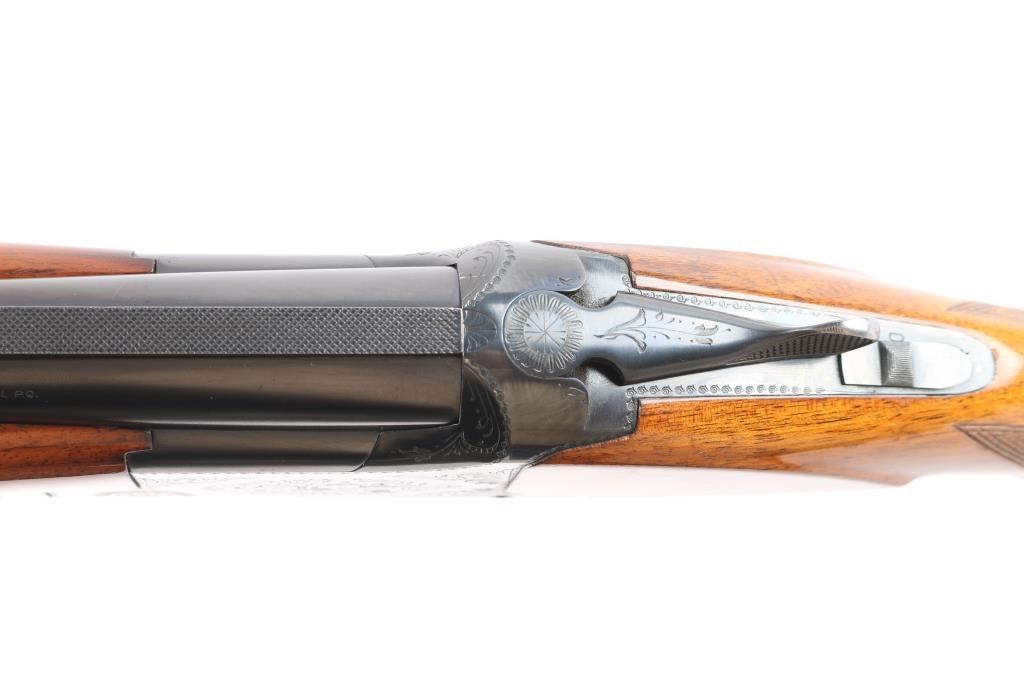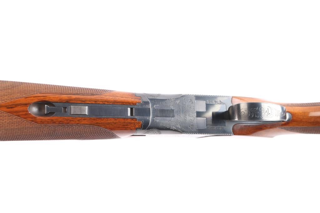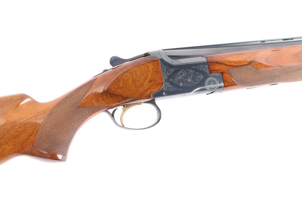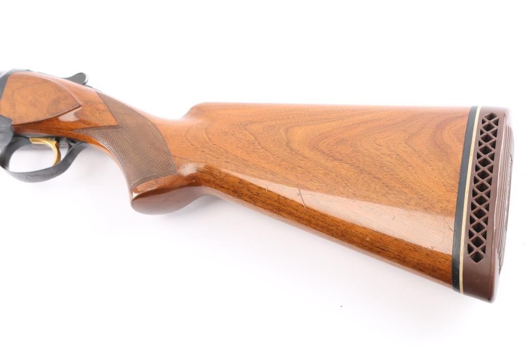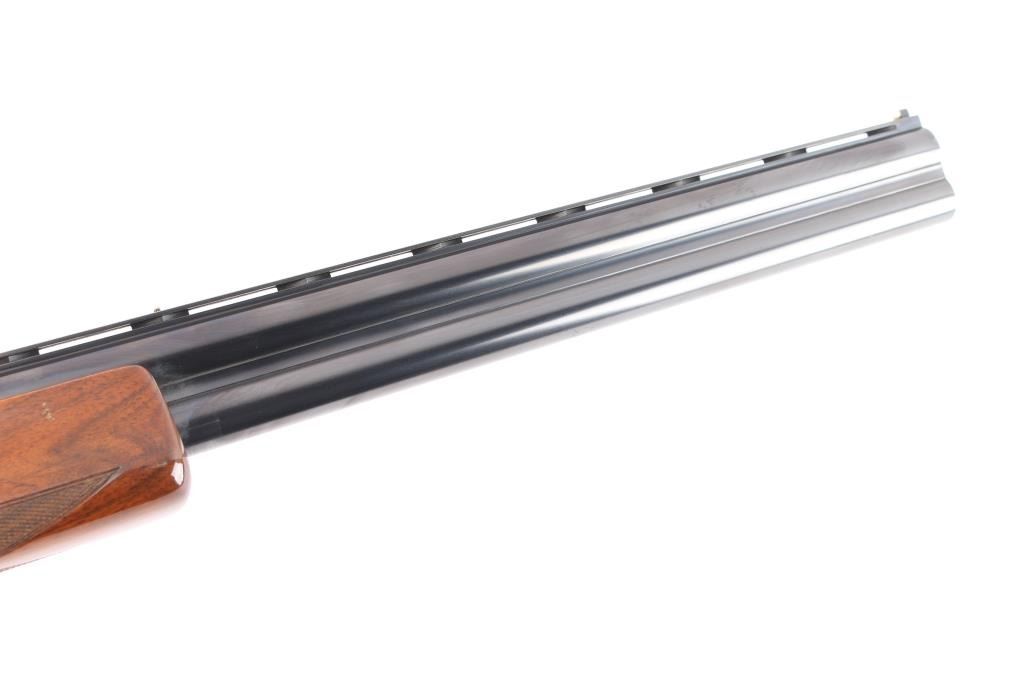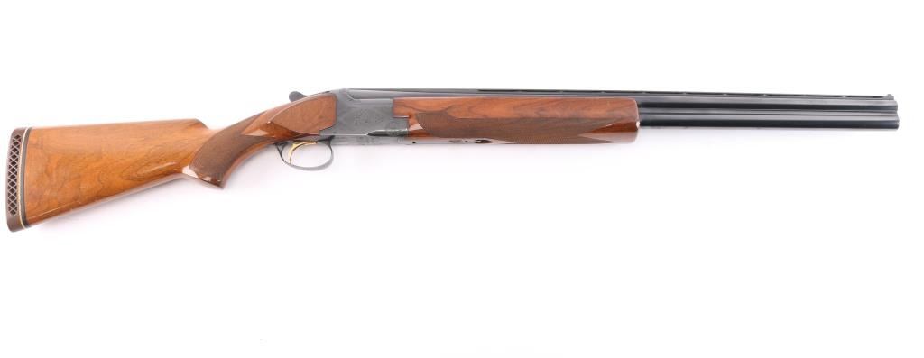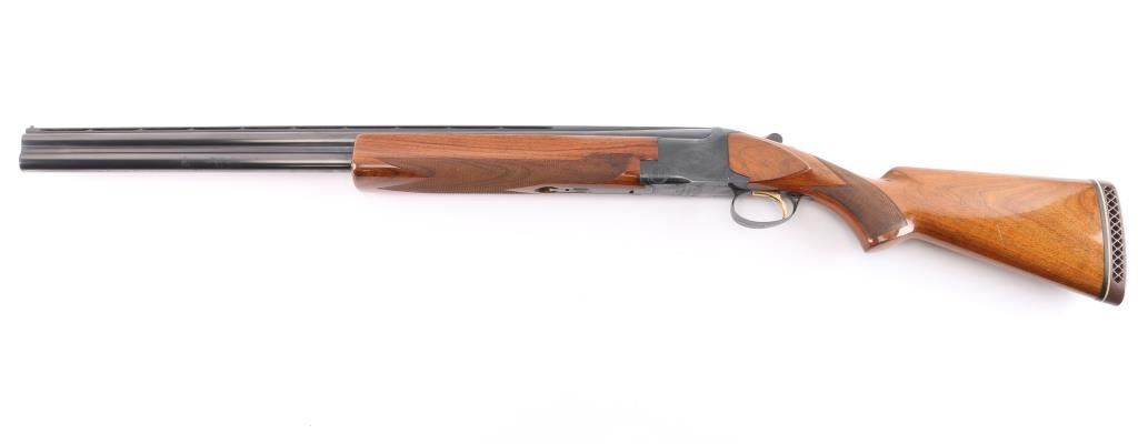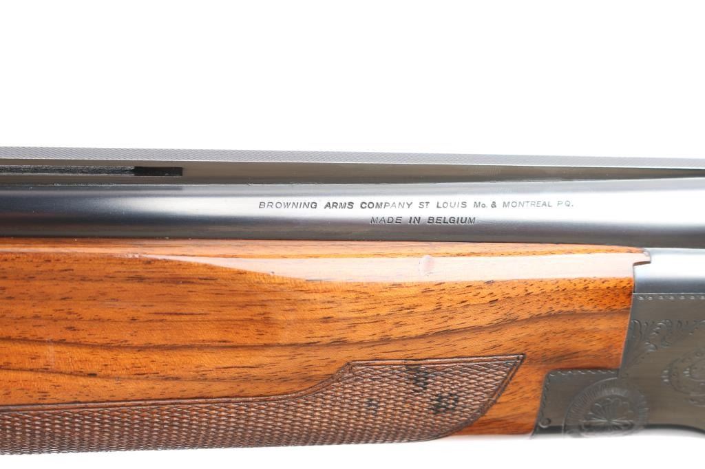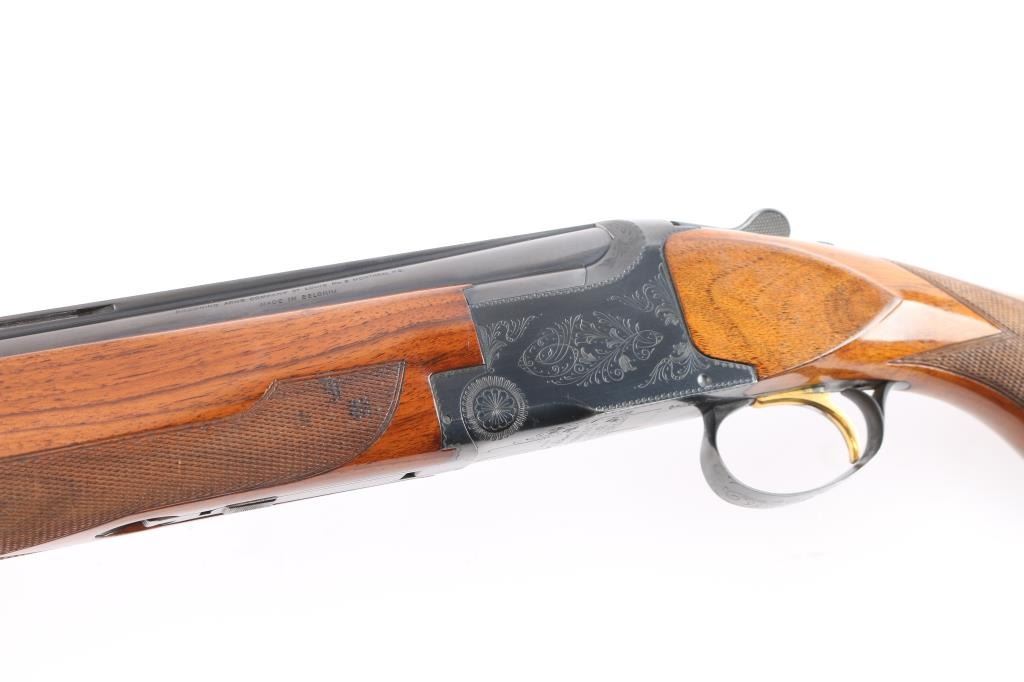 Belgium made O/U shotgun chambered for 12 gauge 2 3/4" shells circa 1969. Features 26 1/2" blued, vent rib skeet barrels with white porcelain sighting & mid beads, floral engraved receiver. It offers a gold accent single selective trigger with a trigger select/safety on the tang. Highly figured very nice wood pistol grip stock with checkering at the wrist and forearm and a Browning vented recoil pad. Blue finish looks very good, about 94% with some minor scuffs/edge wear. Wood stocks look great with some very minor scratches. Bores are excellent/bright. LOP is 14", Drop at comb-1 1/2", Drop at heel-2 1/2". Barrels are choked Modified. Tight lock-up.