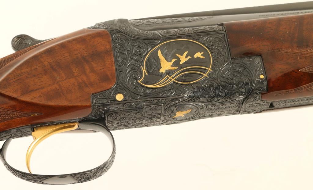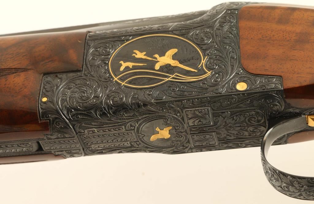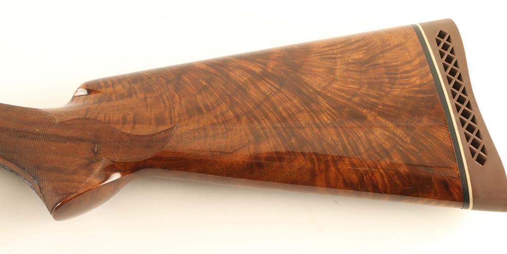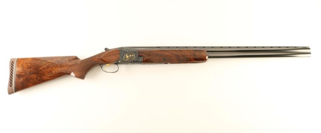 SN: 36559S5 ‘Long Tang’ Vintage exhibition embellished over/under double barrel boxlock shotgun chambered for 2 3/4" 12 gauge shells, manufactured in Belgium by Fabrique Nationale circa 1965. Engraved, gold inlayed and signed by master engraver Louis Vrancken. The full coverage engraving on the receiver features vine type scroll surrounding gold bordered vignettes with three gold pheasants on the left, three gold mallards on right and gold grouse on the bottom. Configuration: blued finish, 30" full/full chokes barrels with ventilated sighting rib & light coverage Acanthus scroll engraving towards the breech, selective automatic ejectors, white bead front sight, gold single selective trigger, knurled top lever, sliding tang safety/barrel selector, finely checkered extra fancy walnut beavertail forend with high gloss finish and semi-pistol grip shoulder stock with factory recoil pad. Stock dimensions: drop at comb 1 3/8", drop at heel 1 9/16” and length of pull 14 3/8". Shotgun retains approximately 98% of its original blued finish showing light scattered handling marks/scratches and some slide wear on the bottom barrel from the forend & on the upper tang from the selector. Action is tight, the bores are excellent and the high gloss finished wood stocks are very good+ showing superficial scratches & small blemishes. Condition is near NRA Excellent. ***C&R Firearm***