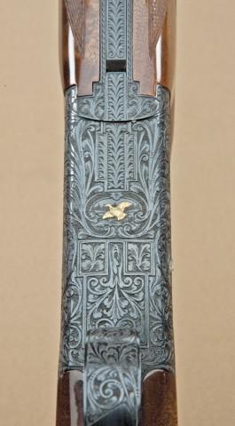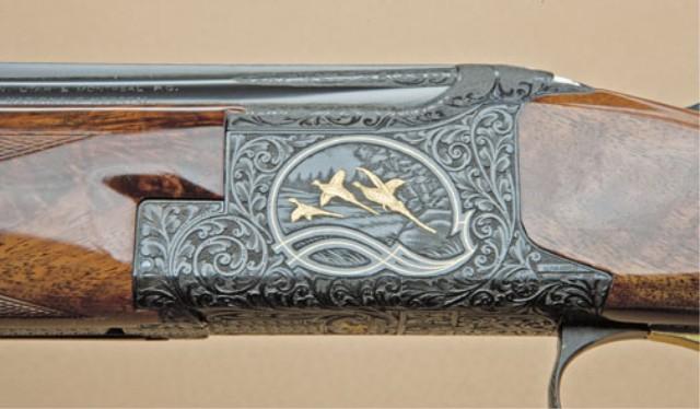 Browning Superposed, Midas grade, Belgian made, 20ga over/under shotgun, 28” barrels, Modified and Full choked like new in original box, serial #P33PN02036. The left bottom of the receiver is signed M. Calabrese an also signed on right rear of frame by same engraver. The gun shows round knob, long tang, and shows almost no use, just some very limited firing, 99% plus. Box shows matching end label. From the Robert Petersen estate. Est: $6,000 - $12,000