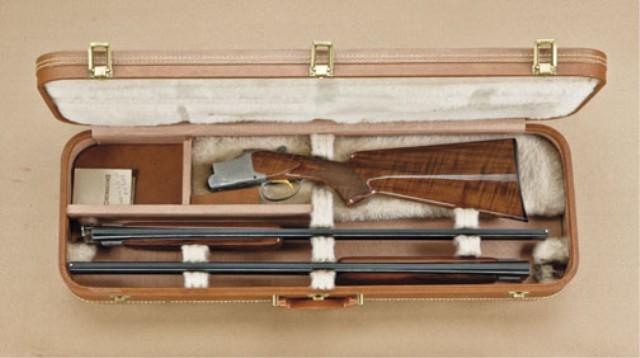 Browning Superposed Pigeon-grade 28ga and 410ga two-barrel set. Single trigger, auto ejector, factory select checkered burl walnut stock, ventilated rib in luggage case, serial #1872F8. The 28ga barrel shows a ventilated rib, 28” in length, choked Skeet and Skeet. 410ga barrel is 28” in length choked Skeet and Skeet. With matching serial number and matching forend for each. The gun remains in fine to excellent condition and is near new, just minimal firing and slight use, minor storage, 98-99% plus. Case shows some slight discoloration to the interior lining, some minor scuffs to the exterior. A desirable set with fully factory length stock and no alterations. Est: $3,000 - $6,000