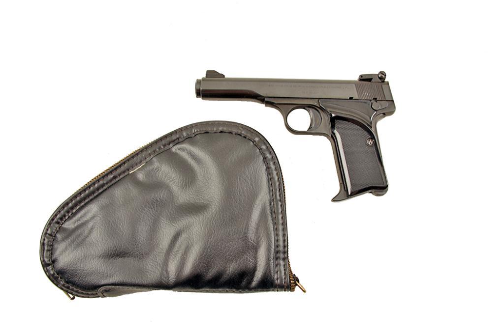 Browning Target 55 Cal .380auto SN:72N15569 Single action semi-auto target pistol made in Belgium. Blued finish, black checkered thumb rest grips, 4 1/2" barrel, adjustable sights, grip safety, cocking indicator, good bore and action. Condition: VerySingle action semi-auto target pistol made in Belgium. Blued finish, black checkered thumb rest grips, 4 1/2" barrel, adjustable sights, grip safety, cocking indicator, good bore and action. Condition: Very good to excellent with very little sign of use. With original Browning carry case.