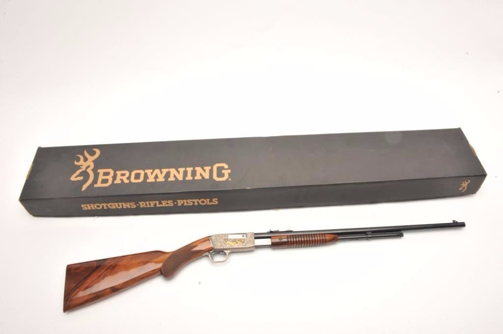Browning Trombone Grade IV Takedown pump action, .22 LR caliber, serial #166CS-01453. The rifle is as new in the original box with all associated packing materials. The rifle features a 22” round barrel with halfmagazine. The barrel and magazine retain all of their high polish blued finish. The receiver is coin finished with beautiful relief engraving and gold inlayed game scenes on both sides of the action. The undersideof the action shows Belgian proofs, while the trigger guard is marked, “G IV”. The finely checkered, high gloss wood stocks are in excellent condition featuring nice grain and fine figure in the walnut. The butt features a round knob pistol grip and ends with a smooth metal butt plate. The bore is excellent, the action crisp and markings are sharp on this exceptional piece. According to the consignor, Browning’s Jack Lanhamindicated that only four of these exquisite Trombones were imported. The lot features the certificates and documentation Id’s as provided. Like the prior lot, this piece is an extraordinary example of Belgian