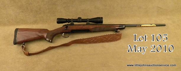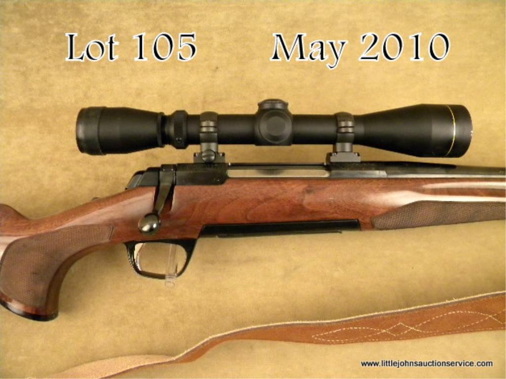 Browning X-Bolt Medallion Model bolt-action rifle, .270 Win only cal., 23” round barrel, blue finish, checkered wood stock with dark hardwood fore end cap, leather sling, mounted with a Leupold scope, #01765MN354. This gun is in overall excellent condition showing the majority of its original finish on metal surfaces, excellent bore, crisp action sharp markings, excellent stock with just a couple small storage mars; hard rubber butt pad; still retaining Browning advertisingsticker on underside of barrel, great optics in scope. Est.: $350-$550.