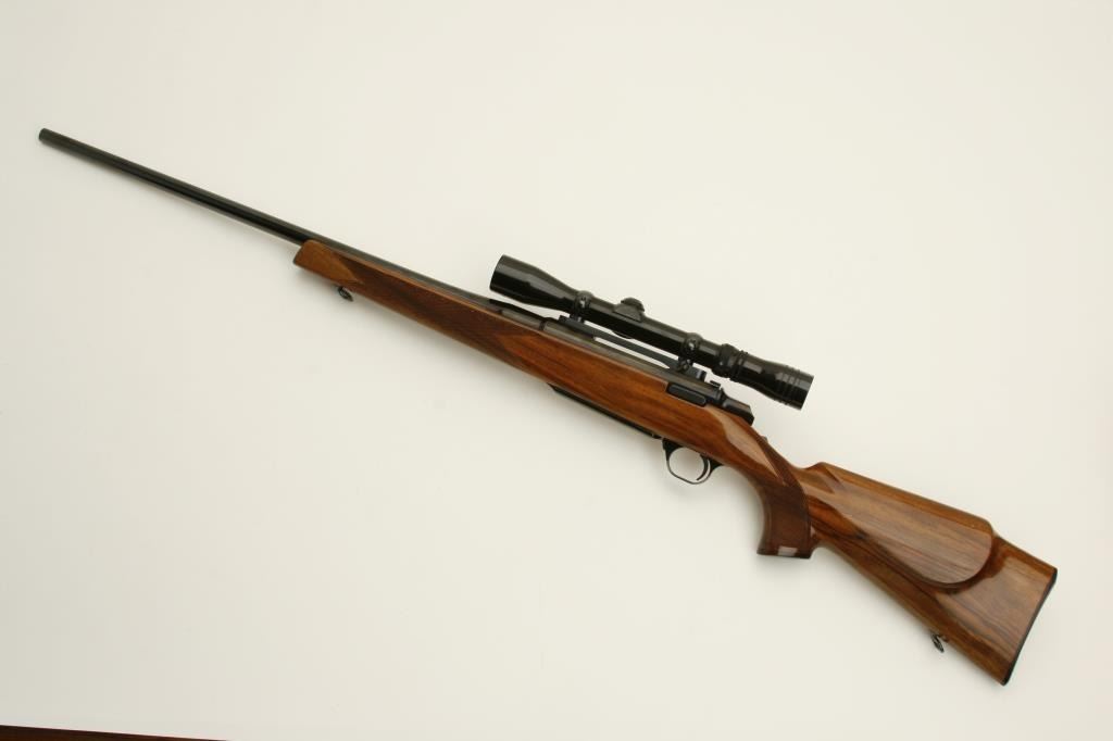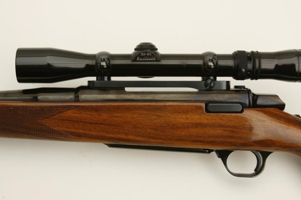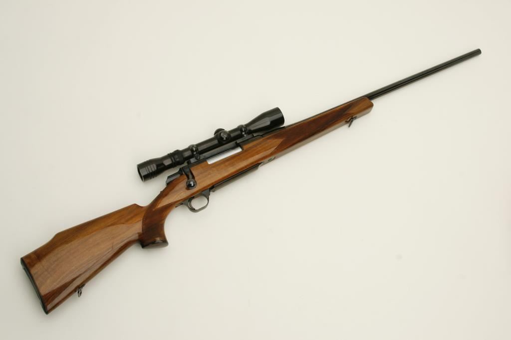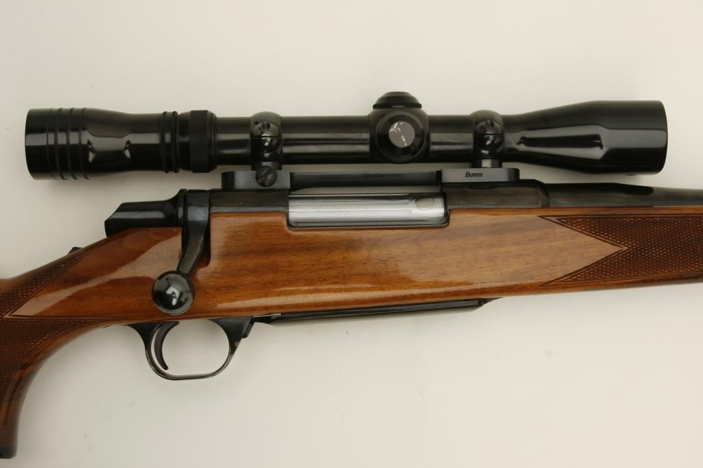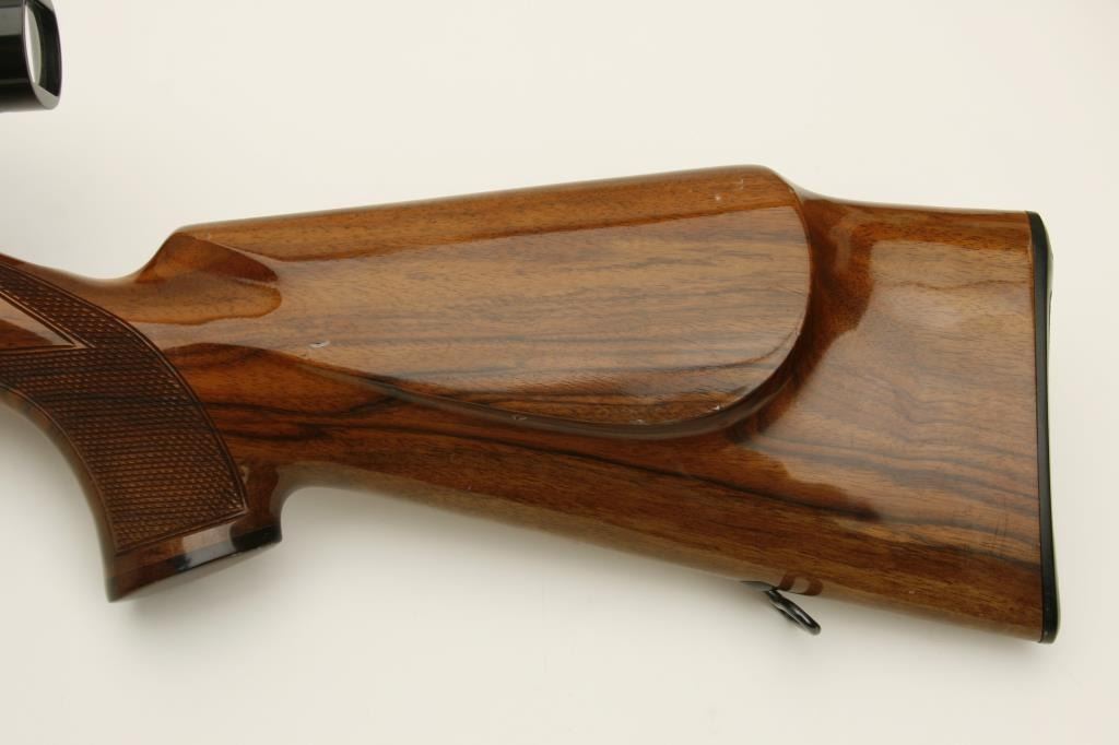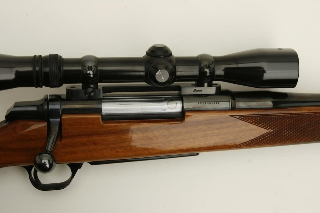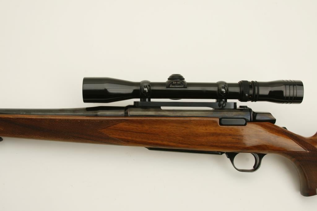 #12114RN117. The rifle is in very good overall condition with a 24” barrel. The barrel and receiver retain the majority of their glossy blue finish with a slight loss at the muzzle and light scratches on the magazine base plate. The finely checkered walnut stocks are in good condition with mars and scratches from field use. The butt stock has dramatic figure to the wood and a Browning marked plastic butt plate. The bore is very good, the action crisp and markings are sharp on this nice Browning bolt gun. (Modern) Est.: $275-$550.