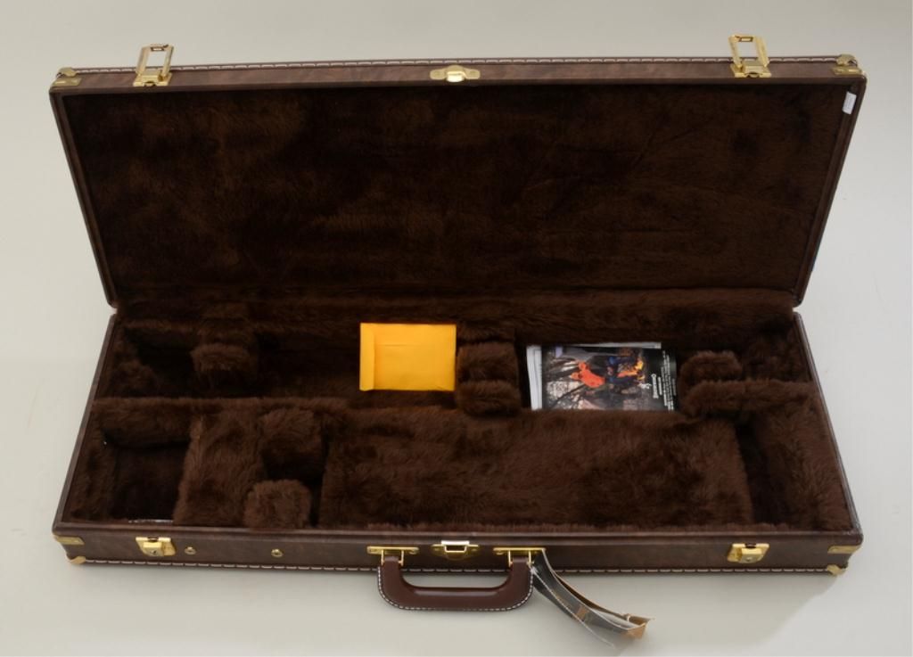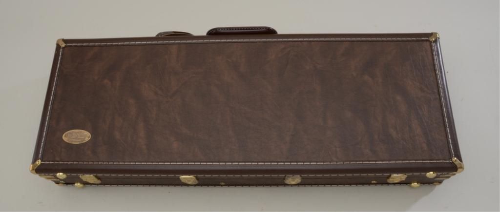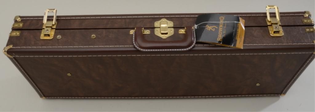 Browning hard case for 26" barreled shotgun two barrel set, 28.5" x 10.5" overall, dark brown vinyl with dark brown interior. Tape on case indicates for 20 gauge and 28 gauge combo, new. Excellent condition and stillretains the original hang tag on the handle. Est. $150-300.