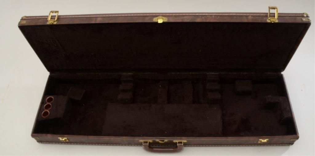 Browning hard case for 30" shotgun two barrel set, 36" x 10.5" overall, for 12 gauge set, dark brown vinyl with dark brown interior. Very good used condition showing minor marks from storage and use. Est. $150-300.