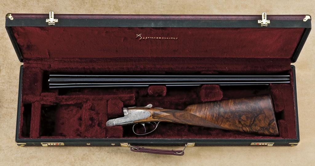 Browning special grade 100th centennial 16ga side by side shotgun, with sideplates Anson type action made in collaboration with Lebeau-Courally. Finely engraved in game scenes and signed “C. Baerten”, deluxe checkered walnut stocks with checkered butt, and 27-1/2” barrels. Serial number “008”. The gun remains in fine to near new condition showing no evidence of firing or use, 99% to new with all its original blue and satin finish on action. Case hardening on small parts and interior. Wood is excellent to near mint and shows a soft satin finish. The gun is fitted with automatic ejectors and double triggers and shows an approx. 15” pull from the front of the trigger to the end of the wood butt. Included is a Browning luggage case and original cardboard box. The box is dated 1994 and is serial numbered to match. A small number of unique and fancily ornamented Brownings were made by the factory for their own displays and promotions and factory letter states only approximately 10 units were made and few imported to the U.S. (this may be the only imported example in 16ga). Each was unique unto itself and this is one of that very small number. Est.: $10,000-$20,000