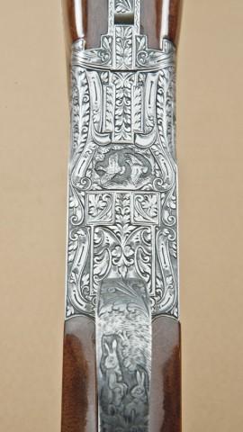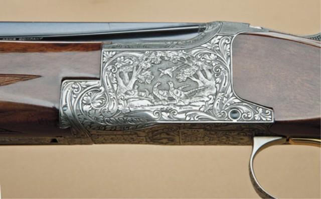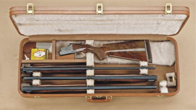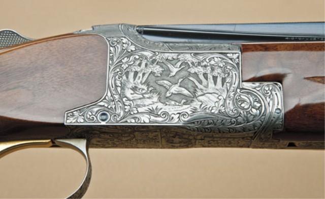 Browning superposed 3-barrel set, pigeon grade, in 410, 28, and 20ga, signed by engraver, A. Marec