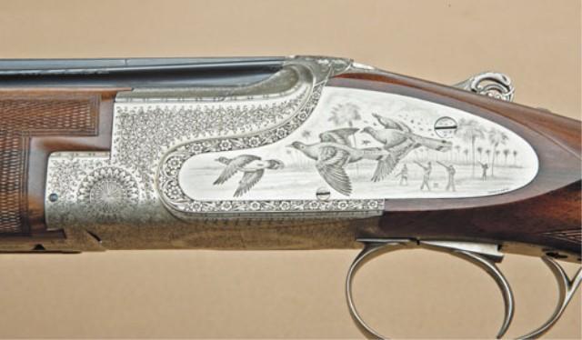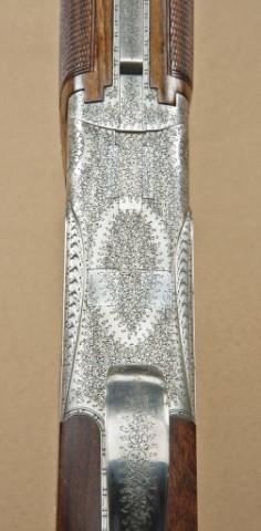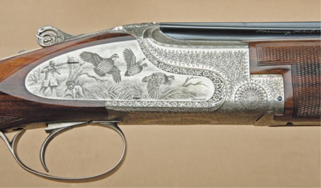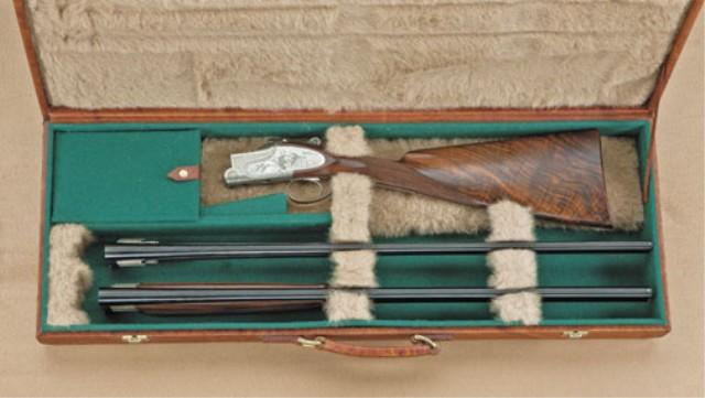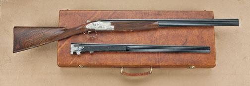 Browning superposed special series Belgian made 410 and 28ga over/under 2-barrel set with exhibition quality features. Serial #047F72. The gun shows factory added sideplates, select European finished burl-wood stock, straight pistol grip, checkered butt, chiseled and pierced release lever, highly engraved action with scenes of bird shooters on each sideplate, surrounded by banknote scroll engraving and chiseled acorns on top of action with satin grey finish, signed on both plates “Vrancken”. The barrel addresses are also finely engraved in script, as is “Made in Belgium”, patent information, gauge, and special steel marking. The 28ga barrels are 27-2/8” in length, showing a non-ventilated milled rib, with single trigger, auto ejector, choked **/**- (Modified over Improved Modified). The 410 barrel measures 27-7/8” showing an identical raised matted rib, choked Full and Full. The gun measures 15-1/4” from the trigger to the end of the checkered wood butt. The floorplate beside the trigger is signed “J. Bearten”. The gun remains in fine to excellent condition, 99% to new, just some slight firing, almost no use. In European type luggage case. Vrancken and Baerten are