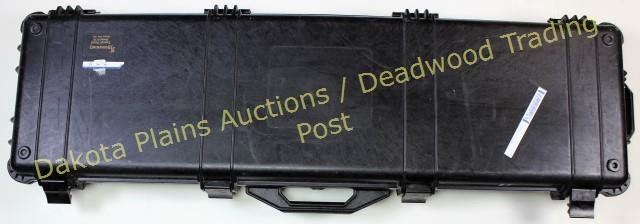 on wheels, cut for double rifles, condition is good, including handles, closures and wheels. Est. 100-200