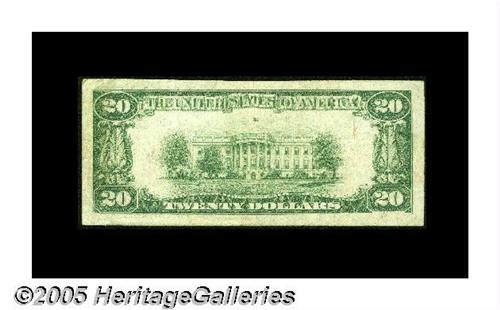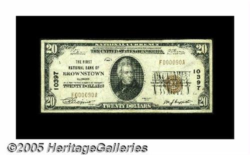<B>Brownstown, IL</B></I> - $20 1929 Ty. 1 <B>The First NB</B></I> Ch. # 10397<BR>An extremely rare note in both large and small size, with Series 1929 examples being even a bit tougher to find than Blue Seals according to the new census. Our records show just three offerings of any kind from here during the past six decades, making this a rare opportunity to obtain any example from this obscure Fayette County location. Pleasing <B>Very Fine.</B></I>