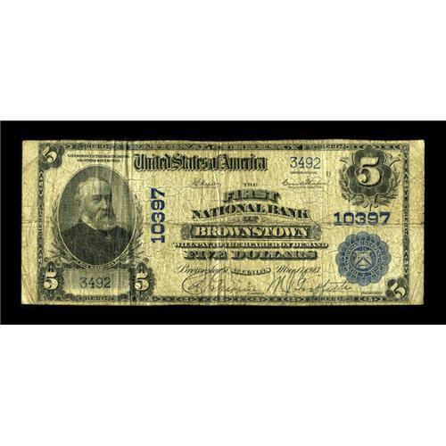 <B>Brownstown, IL</B></I> - $5 1902 Plain Back Fr. 603 <B>The First NB</B></I> Ch. # 10397<BR>Just four large notes make up the census from this Fayette County issuer, the sole National Bank chartered in this community. As one might imagine, offerings from here have been rather sparse, with our records showing only one other large example available at public sale during the past decade. <B>Very Good+,</B></I> with clear pen signatures of C.A. Griffith and M.J. Griffith.<BR><I>From The Lincoln Collection</B></I><BR><BR><b>Shipping:</b> Coins & Currency (<a target="_blank" href="http://www.heritageauctions.com/common/shipping.php">view shipping information</a>)