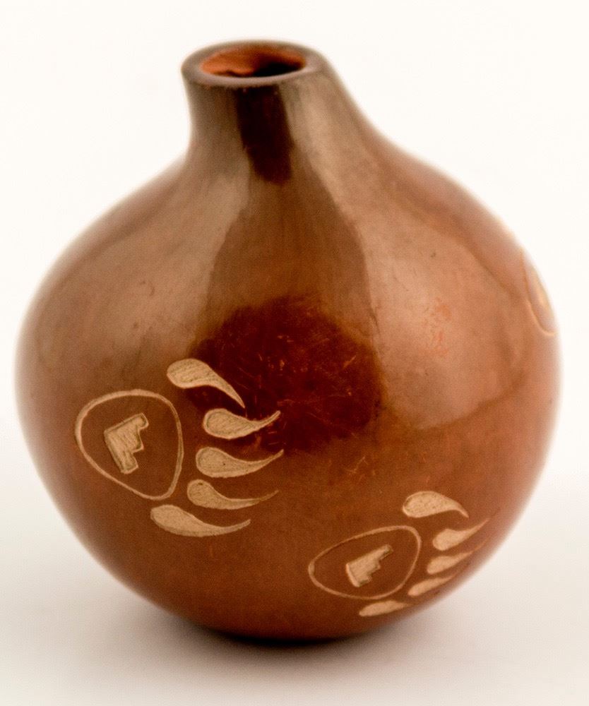 Polished brownware w/ incised bear claws by Christine Nieto. 3" h x 2.75" diameter. This pot by Christine Nieto (1965-2008) is highly polished and traditionally fired. The bowl has a series of five bear paws etched into the surface of the clay. Each bear paw has a kiva step pattern in the center. Christine was known for her brown fired pottery and delicately etched designs. Date: c.1998 Location: Santa Clara Pueblo, New Mexico HWAC # 52102