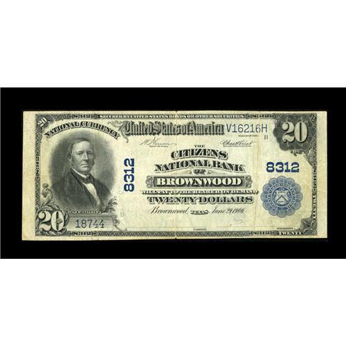 <B>Brownwood, TX</B></I> - $20 1902 Plain Back Fr. 652 <B>The Citizens NB</B></I> Ch. # 8312<BR>Chartered in 1906, this bank went out in 1931. The example we offer tonight is fully <B>Very Fine,</B></I> but has faded signatures.<BR><BR><b>Shipping:</b> Coin/Currency (<a target="_blank" href="http://www.heritageauctions.com/common/shipping.php">view shipping information</a>)